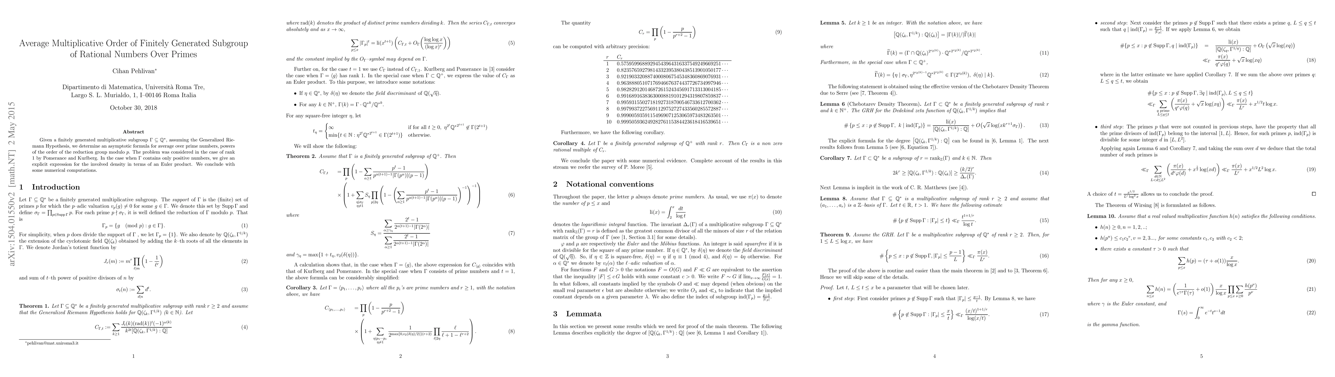 This paper determines an asymptotic formula for the average multiplicative order of finitely generated subgroups of rational numbers over primes, assuming the Generalized Riemann Hypothesis. For subgroups containing only positive numbers, it provides an explicit Euler product expression for the involved density, followed by numerical computations.