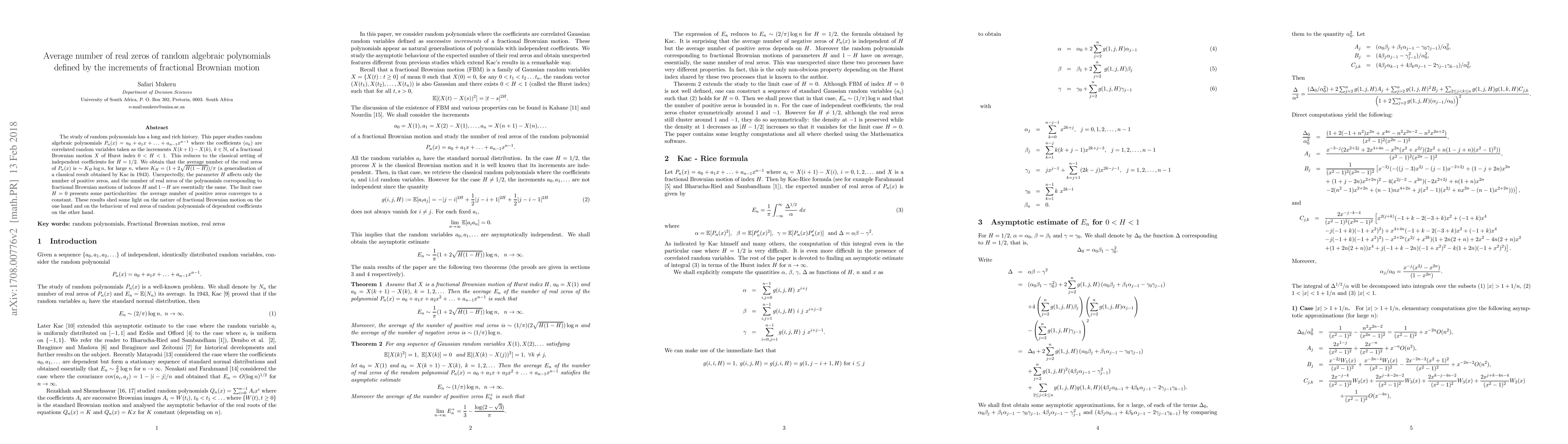 The study of random polynomials has a long and rich history. This paper studies random algebraic polynomials $P_n(x) = a_0 + a_1 x + \ldots + a_{n-1} x^{n-1}$ where the coefficients $(a_k)$ are correlated random variables taken as the increments $X(k+1) - X(k)$, $k\in \mathbb{N}$, of a fractional Brownian motion $X$ of Hurst index $0< H < 1$. This reduces to the classical setting of independent coefficients for $H = 1/2$. We obtain that the average number of the real zeros of $P_n(x)$ is~$\sim K_H \log n$, for large $n$, where $K_H = (1 + 2 \sqrt{H(1-H)})/\pi$ (a generalisation of a classical result obtained by Kac in 1943). Unexpectedly, the parameter $H$ affects only the number of positive zeros, and the number of real zeros of the polynomials corresponding to fractional Brownian motions of indexes $H$ and $1-H$ are essentially the same. The limit case $H = 0$ presents some particularities: the average number of positive zeros converges to a constant. These results shed some light on the nature of fractional Brownian motion on the one hand and on the behaviour of real zeros of random polynomials of dependent coefficients on the other hand.