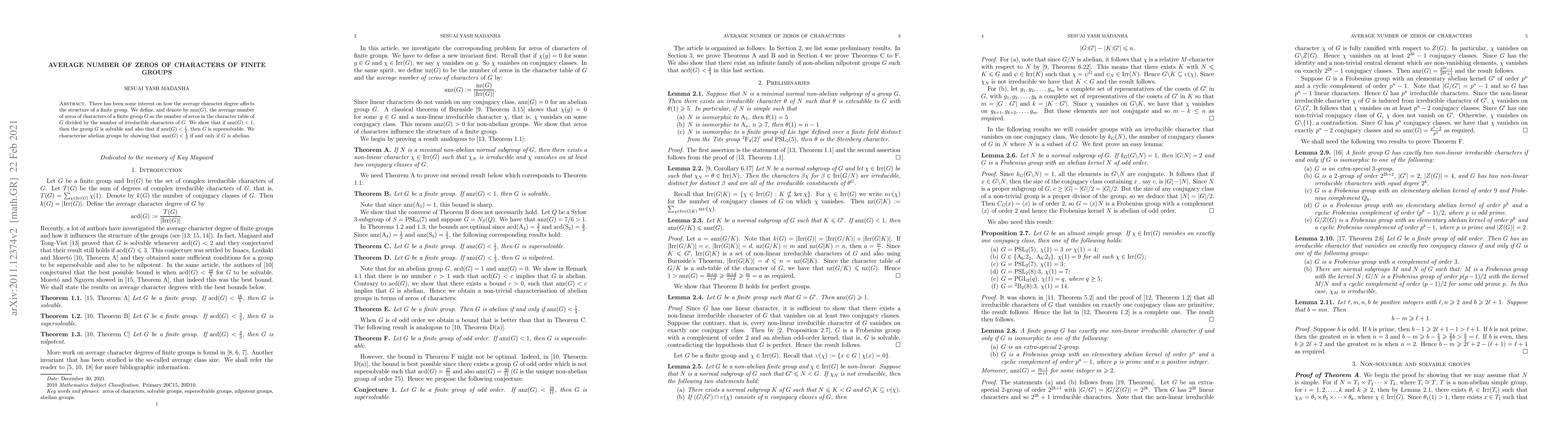 This paper defines the average number of zeros of characters of a finite group, denoted by $ \mathrm{anz}(G) $, and explores its implications on the group's structure. It proves that $ G $ is solvable if $ \mathrm{anz}(G) < 1 $, supersolvable if $ \mathrm{anz}(G) < \frac{1}{2} $, and is abelian if $ \mathrm{anz}(G) < \frac{1}{3} $.