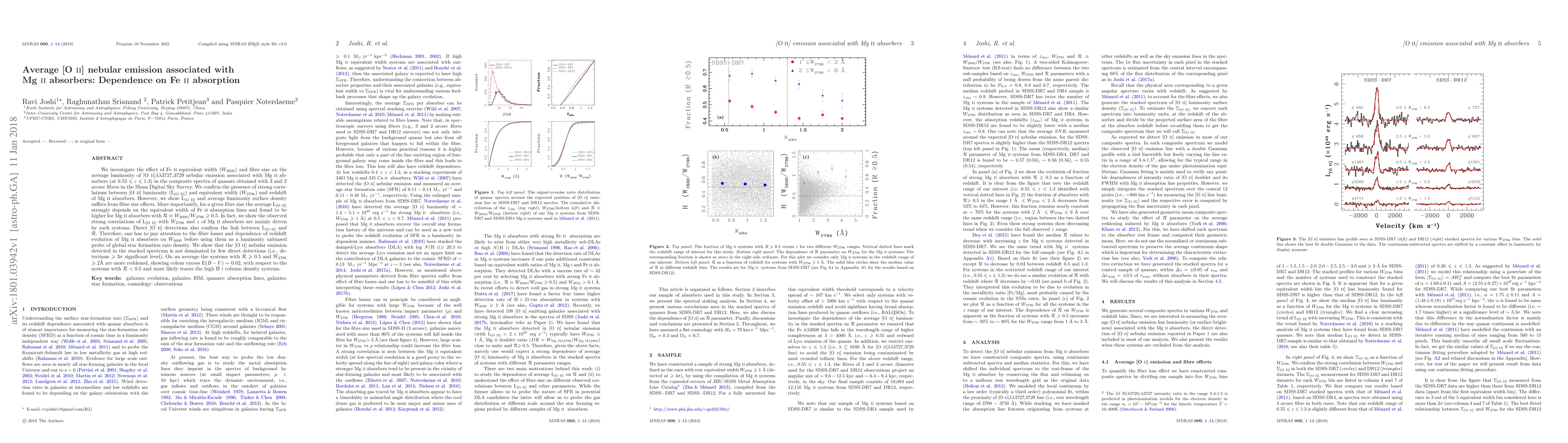 This study investigates the average [O II] nebular emission luminosity associated with Mg II absorbers in quasar spectra, finding strong correlations between [O II] luminosity and the equivalent width of Fe II absorption lines. The research highlights the dependency of [O II] luminosity on fibre size and the ratio of Fe II to Mg II absorption, suggesting caution in using Mg II absorbers as unbiased probes of star formation.