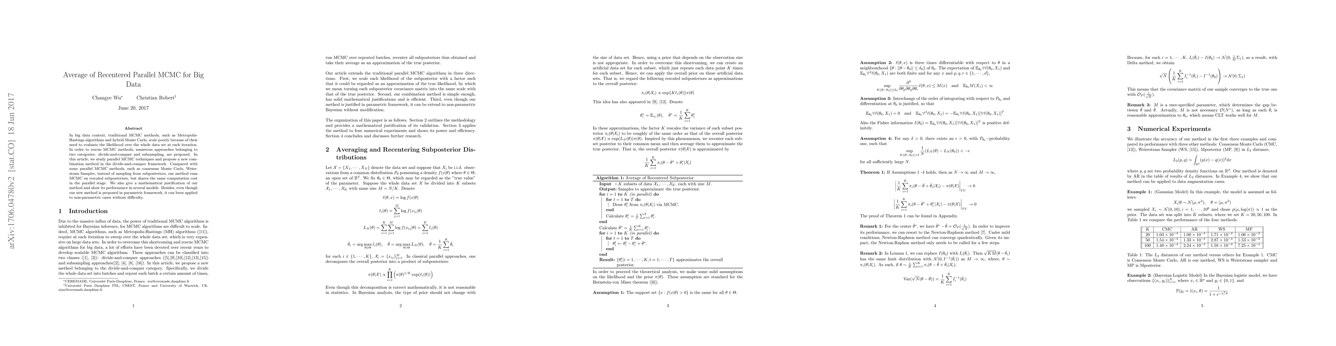 This paper proposes a new parallel MCMC method called Average of Recentered Parallel MCMC for big data, which runs MCMC on rescaled subposteriors instead of subsampling. The method shares the same computation cost in parallel stages and outperforms existing parallel MCMC methods, while also being applicable to non-parametric cases.