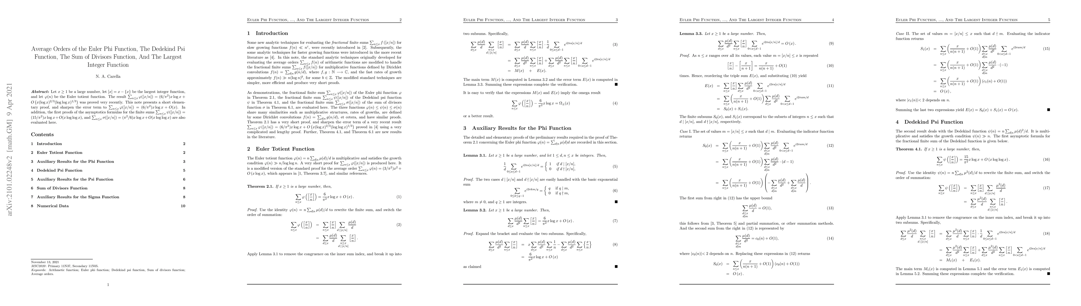 Let $ x\geq 1 $ be a large number, let $ [x]=x-\{x\} $ be the largest integer function, and let $ \varphi(n)$ be the Euler totient function. The result $ \sum_{n\leq x}\varphi([x/n])=(6/\pi^2)x\log x+O\left ( x(\log x)^{2/3}(\log\log x)^{1/3}\right ) $ was proved very recently. This note presents a short elementary proof, and sharpen the error term to $ \sum_{n\leq x}\varphi([x/n])=(6/\pi^2)x\log x+O(x) $. In addition, the first proofs of the asymptotics formulas for the finite sums $ \sum_{n\leq x}\psi([x/n])=(15/\pi^2)x\log x+O(x\log \log x) $, and $ \sum_{n\leq x}\sigma([x/n])=(\pi^2/6)x\log x+O(x \log \log x) $ are also evaluated here.