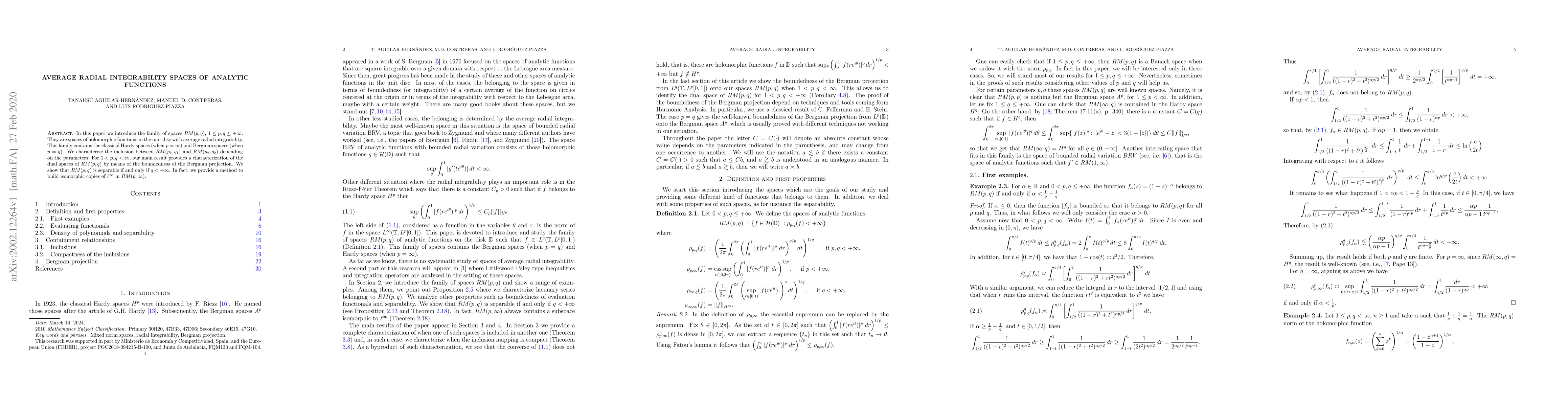 This paper introduces the $RM(p,q)$ spaces of holomorphic functions in the unit disc with average radial integrability, encompassing classical Hardy and Bergman spaces. The study characterizes inclusions and dual spaces of these spaces, revealing that $RM(p,q)$ is separable if $q$ is finite, and provides a method to construct $\ell^\infty$ copies within $RM(p,\infty)$.