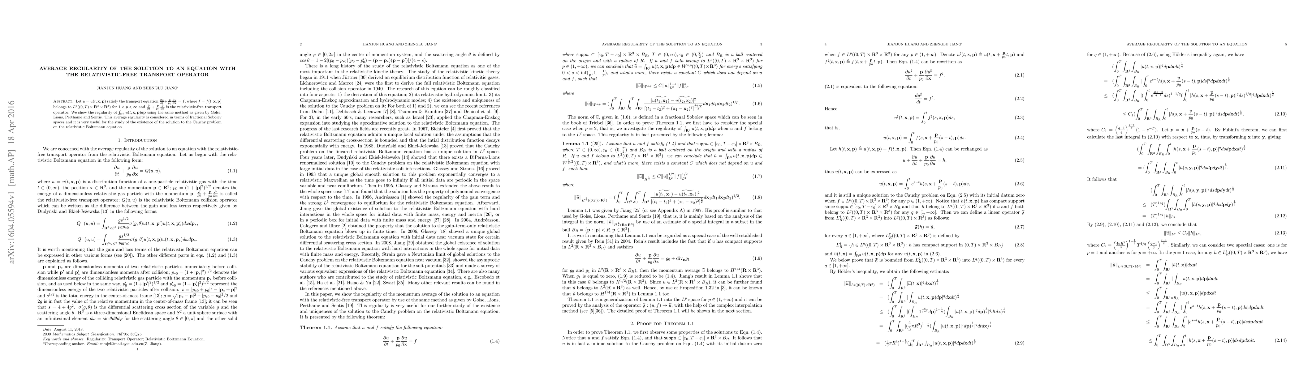 Let $u=u(t,{\bf x},{\bf p})$ satisfy the transport equation $\frac {\partial u}{\partial t}+\frac {{\bf p}}{p_0}\frac{\partial u}{\partial{\bf x}}=f$, where $f=f(t,\bf x,\bf p)$ belongs to $ L^{p}((0,T)\times {\bf R}^{3}\times {\bf R}^{3})$ for $1
