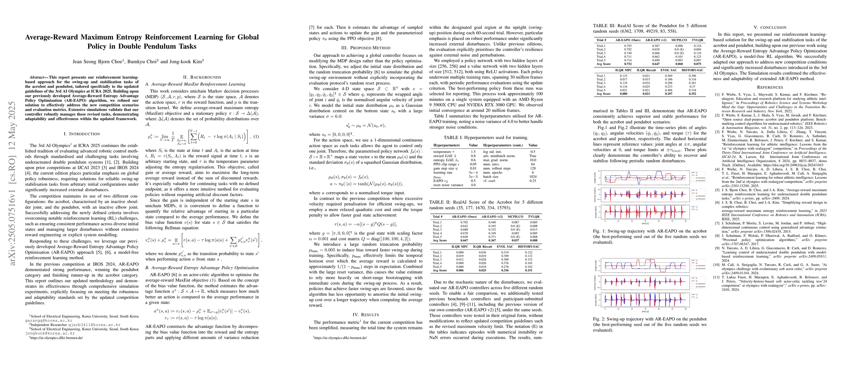 This report presents our reinforcement learning-based approach for the swing-up and stabilisation tasks of the acrobot and pendubot, tailored specifcially to the updated guidelines of the 3rd AI Olympics at ICRA 2025. Building upon our previously developed Average-Reward Entropy Advantage Policy Optimization (AR-EAPO) algorithm, we refined our solution to effectively address the new competition scenarios and evaluation metrics. Extensive simulations validate that our controller robustly manages these revised tasks, demonstrating adaptability and effectiveness within the updated framework.