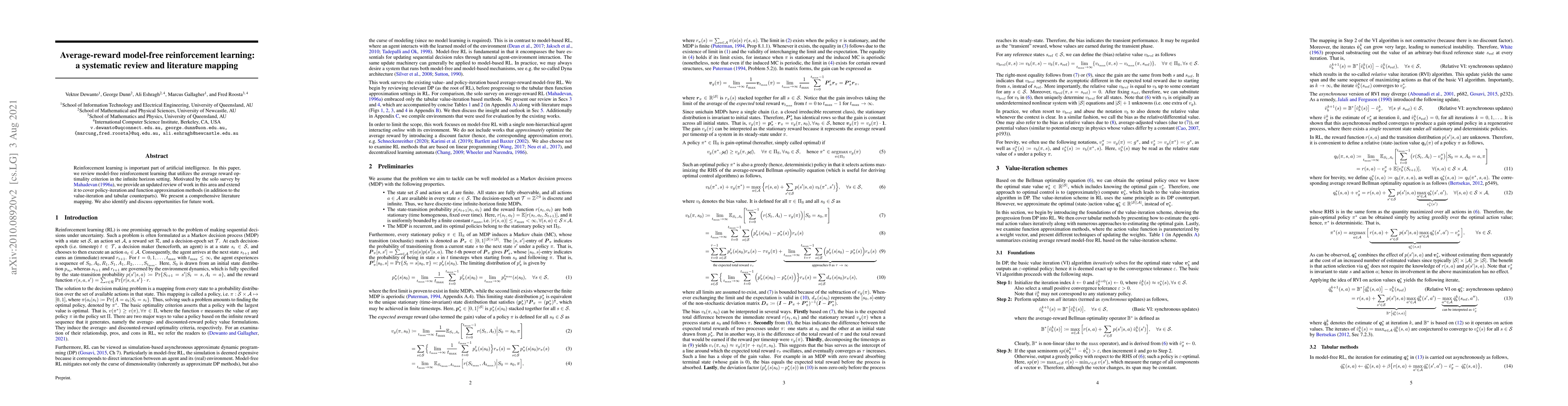 This paper systematically reviews model-free reinforcement learning methods that use the average-reward optimality criterion, extending previous work to include policy-iteration and function approximation techniques. It provides a comprehensive literature mapping and identifies future research opportunities.