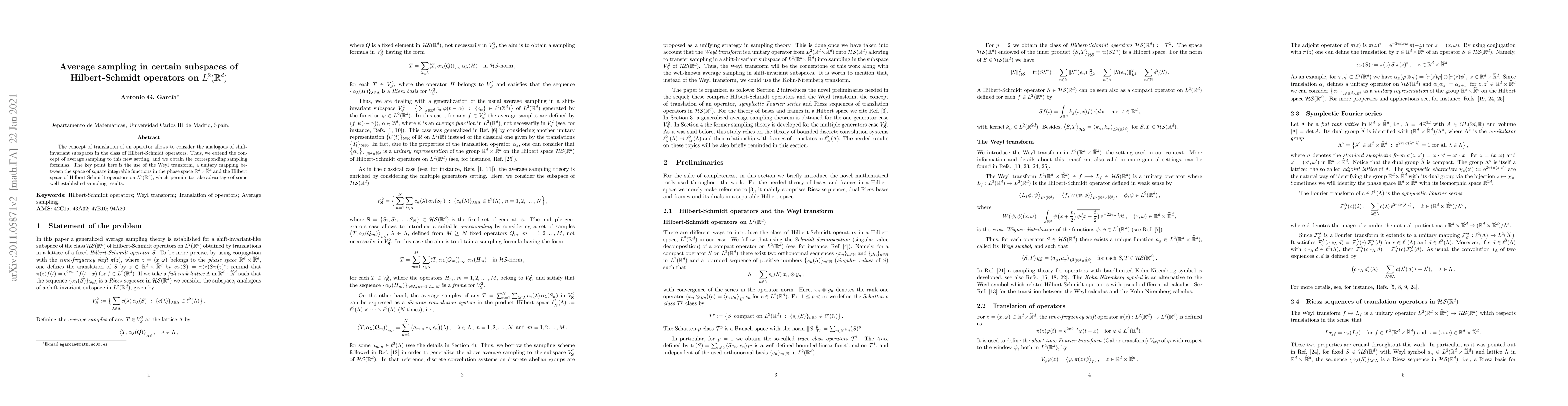 The concept of translation of an operator allows to consider the analogous of shift-invariant subspaces in the class of Hilbert-Schmidt operators. Thus, we extend the concept of average sampling to this new setting, and we obtain the corresponding sampling formulas. The key point here is the use of the Weyl transform, a unitary mapping between the space of square integrable functions in the phase space $\mathbb{R}^d\times \widehat{\mathbb{R}}^d$ and the Hilbert space of Hilbert-Schmidt operators on $L^2(\mathbb{R}^d)$, which permits to take advantage of some well established sampling results.
