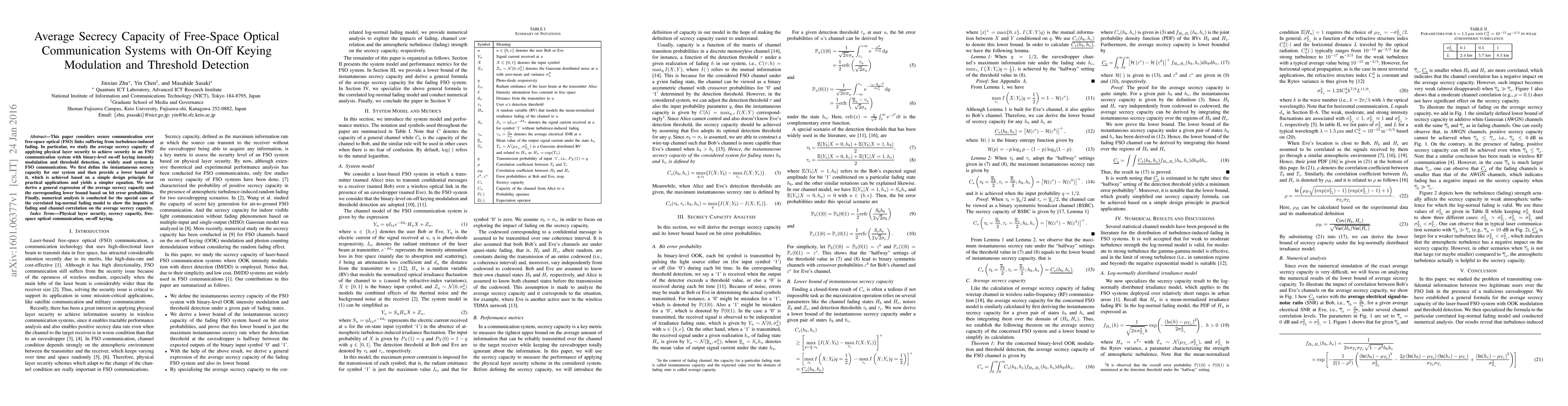 This paper considers secure communication over free-space optical (FSO) links suffering from turbulence-induced fading. In particular, we study the average secrecy capacity of applying physical layer security to achieve security in an FSO communication system with binary-level on-off keying intensity modulation and threshold detection, a widely used system in FSO communication. We first define the instantaneous secrecy capacity for our system and then provide a lower bound of it, which is achieved based on a simple design principle for practical applications and yields a simpler equation. We next derive a general expression of the average secrecy capacity and the corresponding lower bound based on bit error probabilities. Finally, numerical analysis is conducted for the special case of the correlated log-normal fading model to show the impacts of fading and channel correlation on the average secrecy capacity.