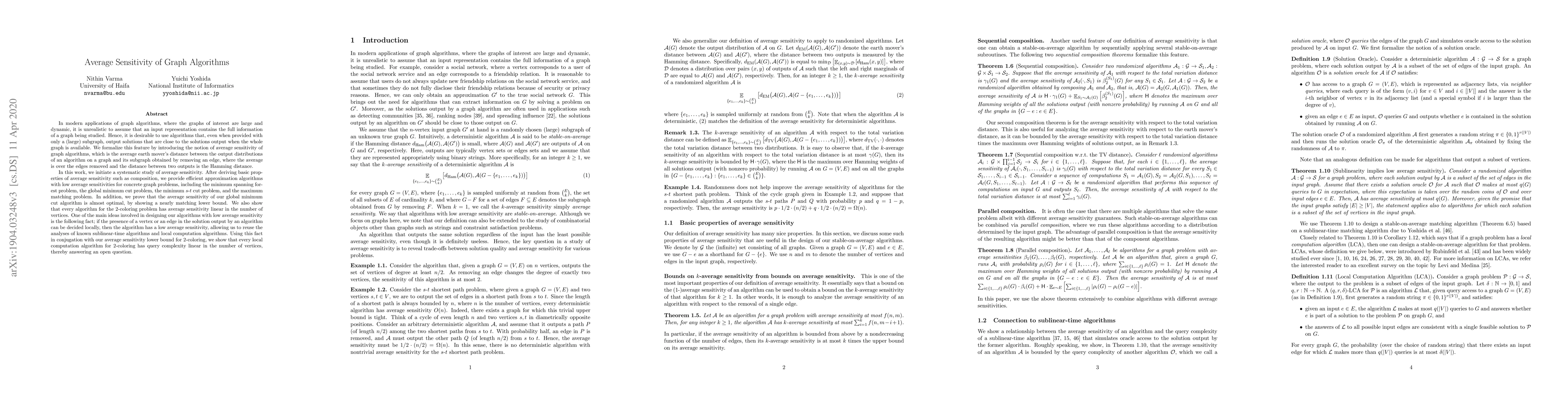 In modern applications of graphs algorithms, where the graphs of interest are large and dynamic, it is unrealistic to assume that an input representation contains the full information of a graph being studied. Hence, it is desirable to use algorithms that, even when only a (large) subgraph is available, output solutions that are close to the solutions output when the whole graph is available. We formalize this idea by introducing the notion of average sensitivity of graph algorithms, which is the average earth mover's distance between the output distributions of an algorithm on a graph and its subgraph obtained by removing an edge, where the average is over the edges removed and the distance between two outputs is the Hamming distance. In this work, we initiate a systematic study of average sensitivity. After deriving basic properties of average sensitivity such as composition, we provide efficient approximation algorithms with low average sensitivities for concrete graph problems, including the minimum spanning forest problem, the global minimum cut problem, the minimum $s$-$t$ cut problem, and the maximum matching problem. In addition, we prove that the average sensitivity of our global minimum cut algorithm is almost optimal, by showing a nearly matching lower bound. We also show that every algorithm for the 2-coloring problem has average sensitivity linear in the number of vertices. One of the main ideas involved in designing our algorithms with low average sensitivity is the following fact; if the presence of a vertex or an edge in the solution output by an algorithm can be decided locally, then the algorithm has a low average sensitivity, allowing us to reuse the analyses of known sublinear-time algorithms and local computation algorithms (LCAs). Using this connection, we show that every LCA for 2-coloring has linear query complexity, thereby answering an open question.