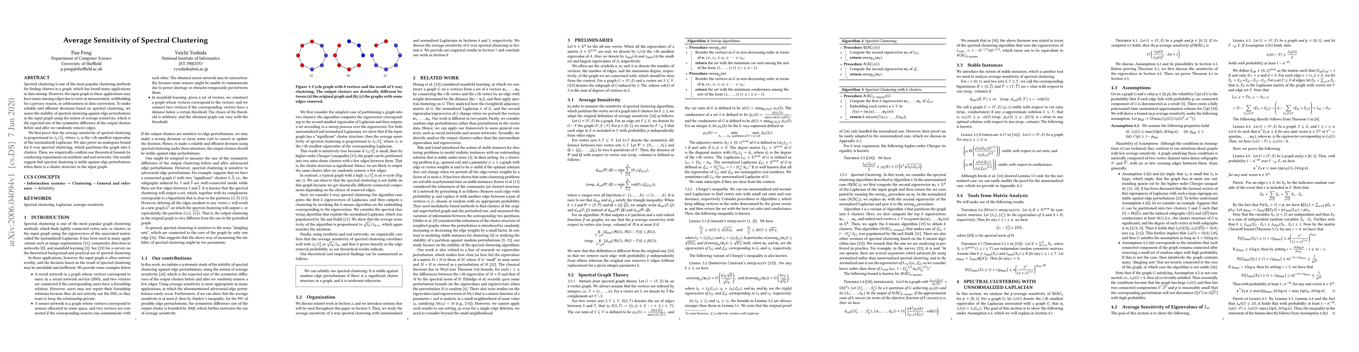 This paper assesses the stability of spectral clustering under edge perturbations using average sensitivity, showing that the method's stability is proportional to $\lambda_2/\lambda_3^2$ of the graph's Laplacian eigenvalues. Empirical results confirm theoretical bounds, indicating spectral clustering's robustness when a cluster structure exists.