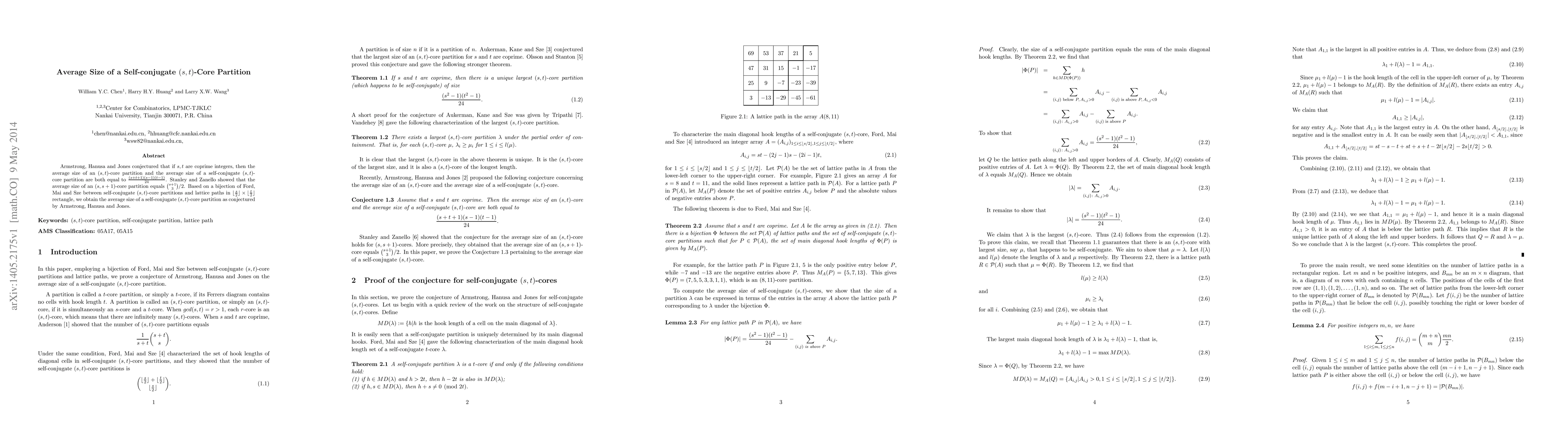 The paper provides a proof of the Armstrong-Hanusa-Jones conjecture using a bijection between self-conjugate (s, t)-core partitions and lattice paths, leading to a closed-form expression for their average size.