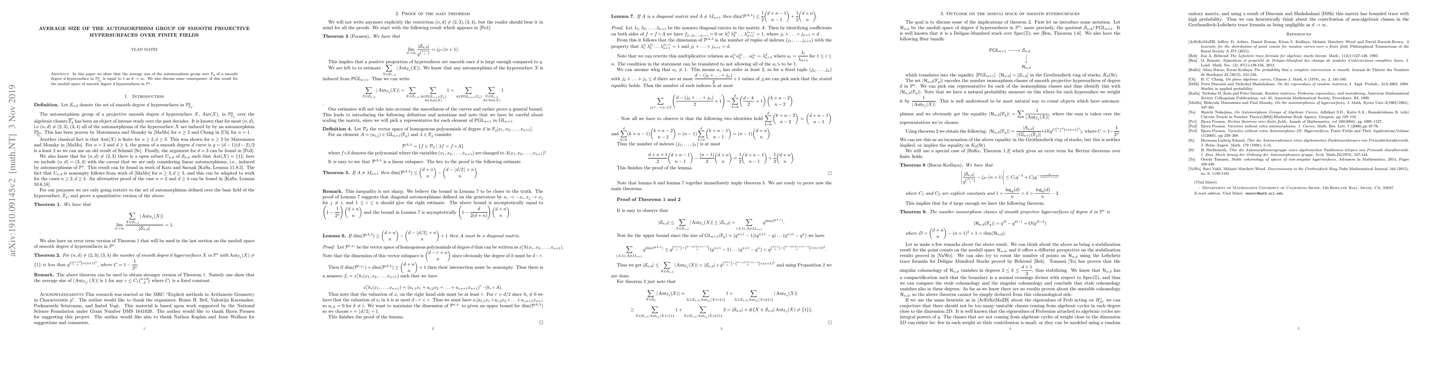 This paper demonstrates that the average size of the automorphism group of smooth degree $d$ projective hypersurfaces over $\mathbb{F}_q$ tends to $1$ as $d$ approaches infinity, with implications for the moduli space of such hypersurfaces.