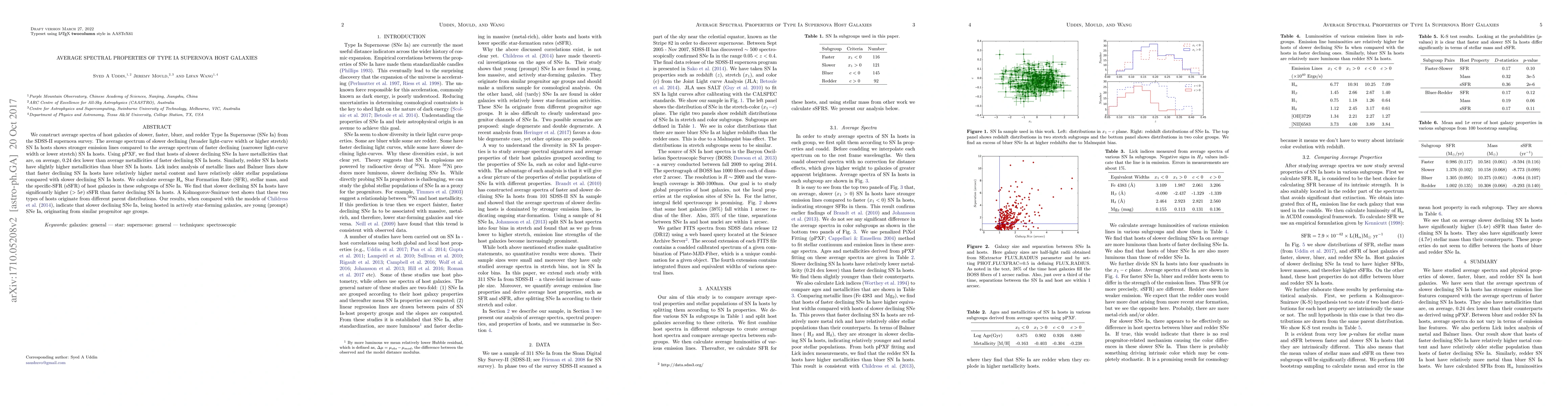 We construct average spectra of host galaxies of slower, faster, bluer, and redder Type Ia Supernovae (SNe Ia) from the SDSS-II supernova survey. The average spectrum of slower declining (broader light-curve width or higher stretch) SN Ia hosts shows stronger emission lines compared to the average spectrum of faster declining (narrower light-curve width or lower stretch) SN Ia hosts. Using pPXF, we find that hosts of slower declining SNe Ia have metallicities that are, on average, 0.24 dex lower than average metallicities of faster declining SN Ia hosts. Similarly, redder SN Ia hosts have slightly higher metallicities than bluer SN Ia hosts. Lick index analysis of metallic lines and Balmer lines show that faster declining SN Ia hosts have relatively higher metal content and have relatively older stellar populations compared with slower declining SN Ia hosts. We calculate average $\rm H_{\alpha}$ Star Formation Rate (SFR), stellar mass, and the specific-SFR (sSFR) of host galaxies in these subgroups of SNe Ia. We find that slower declining SN Ia hosts have significantly higher ($>5\sigma$) sSFR than faster declining SN Ia hosts. A Kolmogorov-Smirnov test shows that these two types of hosts originate from different parent distributions. Our results, when compared with the models of \cite{childress14}, indicate that slower declining SNe Ia, being hosted in actively star-forming galaxies, are young (prompt) SNe Ia, originating from similar progenitor age groups.