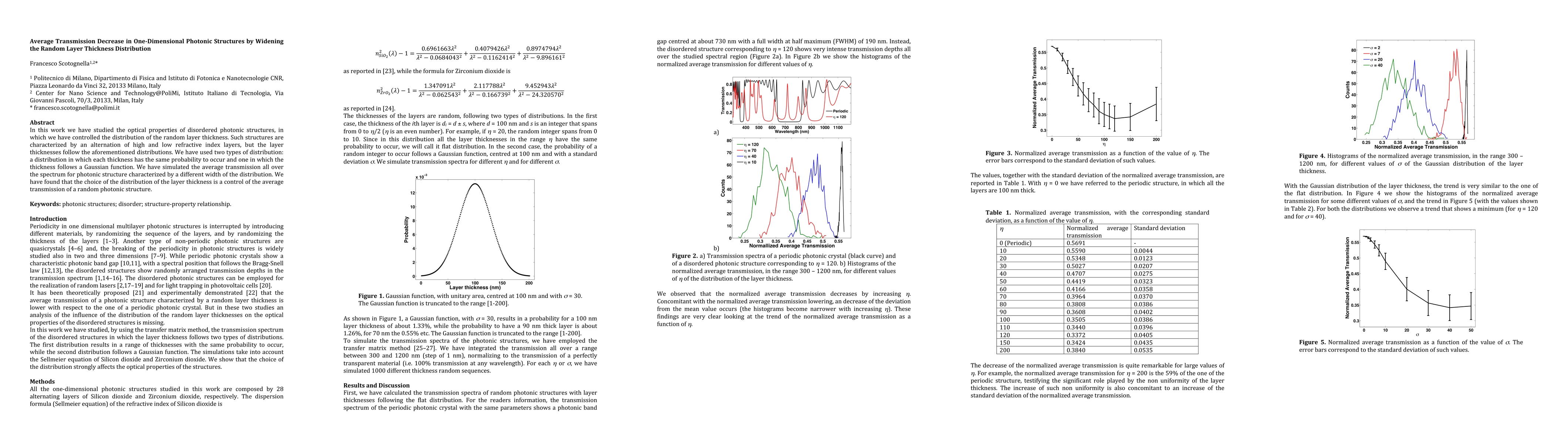 This study investigates how varying the distribution of random layer thicknesses in one-dimensional photonic structures affects average transmission across the spectrum. The results show that both uniform and Gaussian thickness distributions significantly influence the transmission, with wider distributions generally decreasing average transmission.