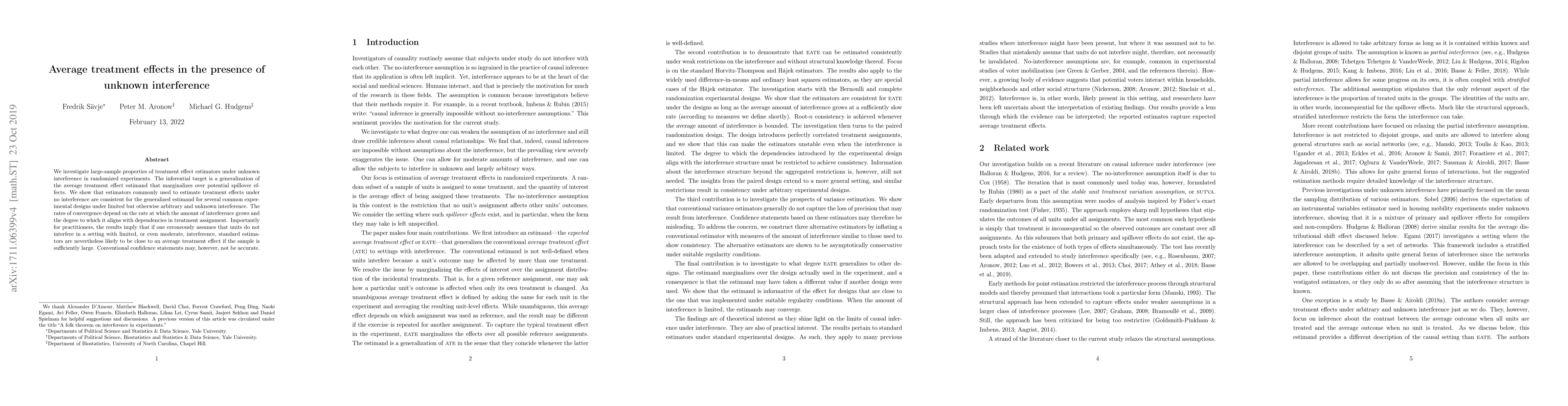 This paper examines treatment effect estimators in randomized experiments with unknown interference, showing that standard estimators remain consistent for a generalized average treatment effect even under limited interference. However, conventional confidence intervals may not be reliable in such settings.