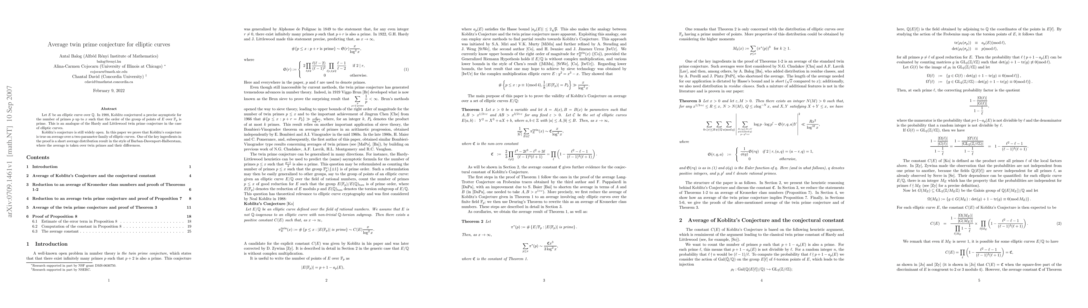 Let E be an elliptic curve over Q. In 1988, Koblitz conjectured a precise asymptotic for the number of primes p up to x such that the order of the group of points of E over the finite field F_p is prime. This is an analogue of the Hardy and Littlewood twin prime conjecture in the case of elliptic curves. Koblitz's conjecture is still widely open. In this paper we prove that Koblitz's conjecture is true on average over a two-parameter family of elliptic curves. One of the key ingredients in the proof is a short average distribution result in the style of Barban-Davenport-Halberstam, where the average is taken over twin primes and their differences.