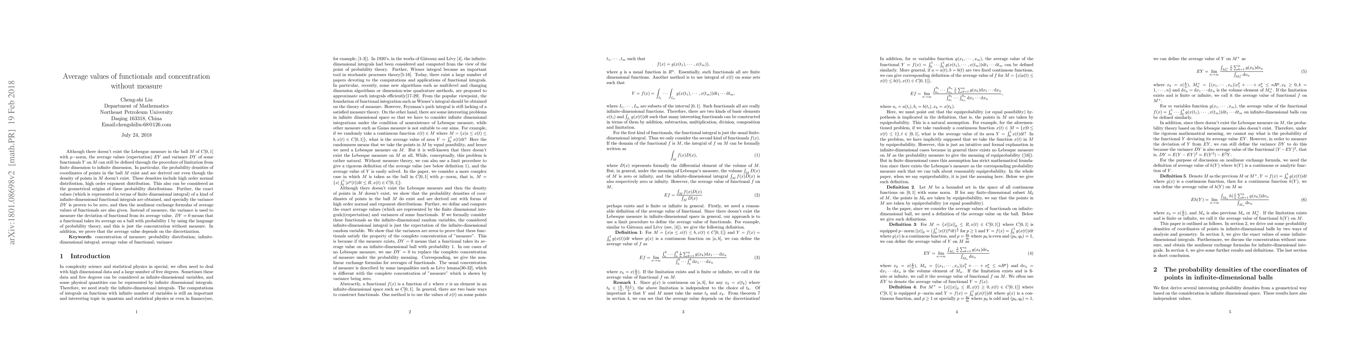 Although there doesn't exist the Lebesgue measure in the ball $M$ of $C[0,1]$ with $p-$norm, the average values (expectation) $EY$ and variance $DY$ of some functionals $Y$ on $M$ can still be defined through the procedure of limitation from finite dimension to infinite dimension. In particular, the probability densities of coordinates of points in the ball $M$ exist and are derived out even though the density of points in $M$ doesn't exist. These densities include high order normal distribution, high order exponent distribution. This also can be considered as the geometrical origins of these probability distributions. Further, the exact values (which is represented in terms of finite dimensional integral) of a kind of infinite-dimensional functional integrals are obtained, and specially the variance $DY$ is proven to be zero, and then the nonlinear exchange formulas of average values of functionals are also given. Instead of measure, the variance is used to measure the deviation of functional from its average value. $DY=0$ means that a functional takes its average on a ball with probability 1 by using the language of probability theory, and this is just the concentration without measure. In addition, we prove that the average value depends on the discretization.