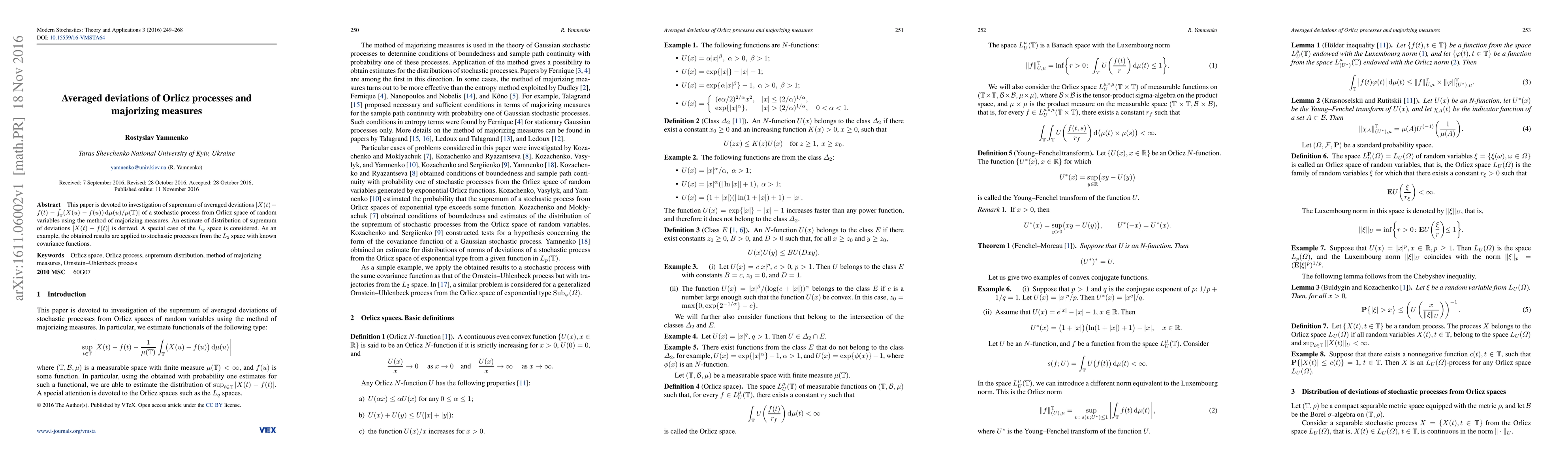 This paper is devoted to investigation of supremum of averaged deviations $|X(t)-f(t)-\int_{\mathbb {T}}(X(u)-f(u))\,\mathrm {d}\mu(u)/\mu(\mathbb {T})|$ of a stochastic process from Orlicz space of random variables using the method of majorizing measures. An estimate of distribution of supremum of deviations $|X(t)-f(t)|$ is derived. A special case of the $L_q$ space is considered. As an example, the obtained results are applied to stochastic processes from the $L_2$ space with known covariance functions.