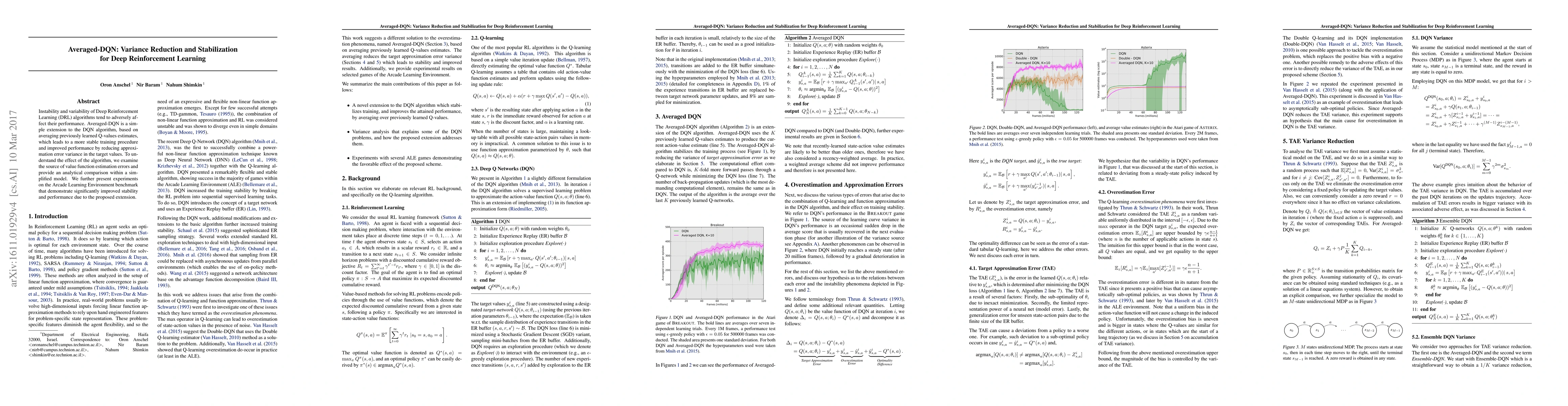 Averaged-DQN stabilizes Deep Reinforcement Learning by averaging previously learned Q-values, reducing variance and improving performance. Experiments on the Arcade Learning Environment show significant stability and performance gains compared to standard DQN.