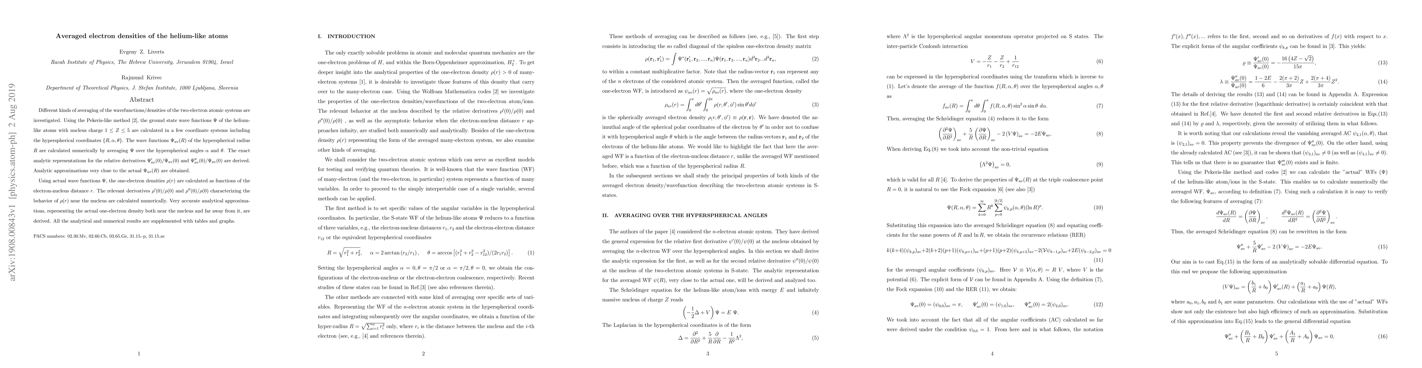 Different kinds of averaging of the wavefunctions/densities of the two-electron atomic systems are investigated. Using the Pekeris-like method, the ground state wave functions $\Psi$ of the helium-like atoms with nucleus charge $1\leq Z\leq5$ are calculated in a few coordinate systems including the hyperspherical coordinates $\left\{R,\alpha,\theta\right\}$. The wave functions $\Psi_{av}(R)$ of the hyperspherical radius $R$ are calculated numerically by averaging $\Psi$ over the hyperspherical angles $\alpha$ and $\theta$. The exact analytic representations for the relative derivatives $\Psi_{av}'(0)/\Psi_{av}(0)$ and $\Psi_{av}''(0)/\Psi_{av}(0)$ are derived. Analytic approximations very close to the actual $\Psi_{av}(R)$ are obtained. Using actual wave functions $\Psi$, the one-electron densities $\rho(r)$ are calculated as functions of the electron-nucleus distance $r$. The relevant derivatives $\rho'(0)/\rho(0)$ and $\rho''(0)/\rho(0)$ characterizing the behavior of $\rho(r)$ near the nucleus are calculated numerically. Very accurate analytical approximations, representing the actual one-electron density both near the nucleus and far away from it, are derived. All the analytical and numerical results are supplemented with tables and graphs.