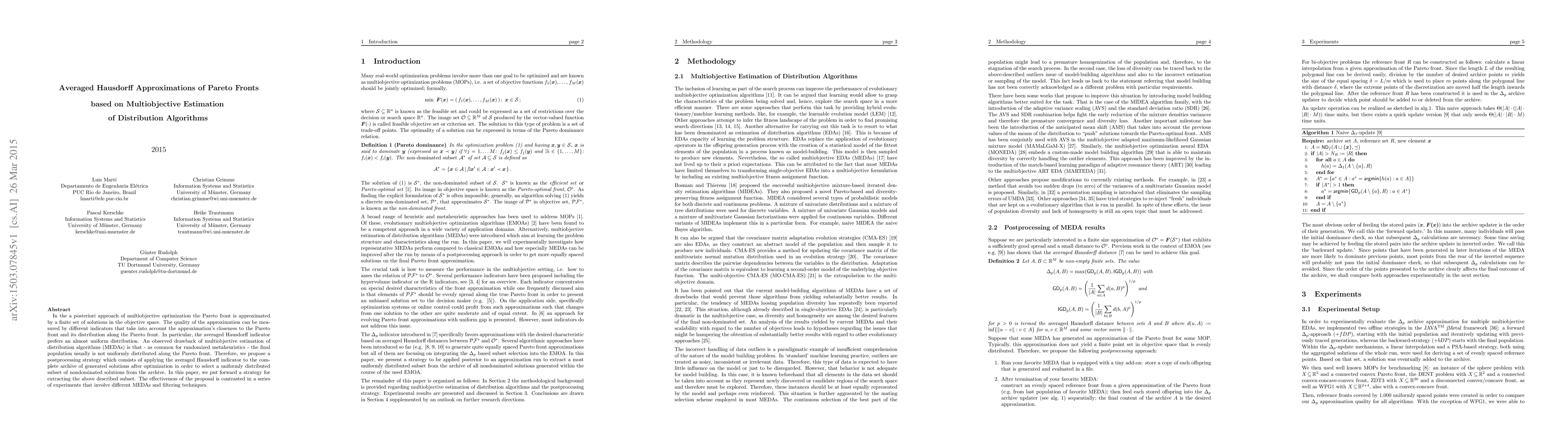 This paper proposes a postprocessing strategy to improve the distribution of solutions along the Pareto front in multiobjective optimization using MEDAs. The strategy involves applying the averaged Hausdorff indicator to select a uniformly distributed subset of nondominated solutions, enhancing the approximation quality. Experiments compare the effectiveness of this approach against various MEDAs and filtering techniques.