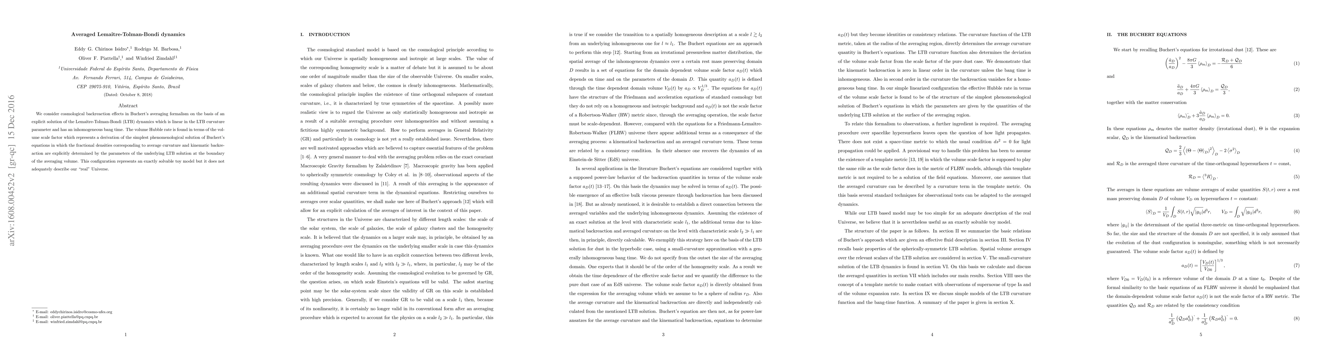 This paper explores cosmological backreaction effects using Buchert's averaging formalism based on an explicit LTB dynamics solution, deriving the volume Hubble rate and determining average curvature and kinematic backreaction densities. Despite being an exactly solvable model, it does not accurately represent our Universe.