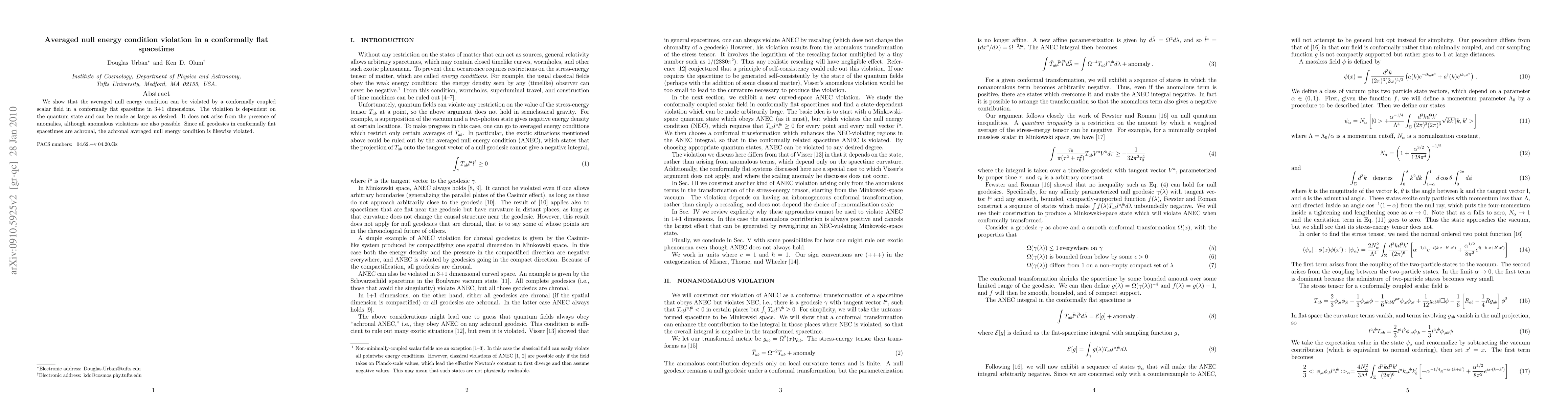 Summary: The research demonstrates that a conformally coupled scalar field in a conformally flat spacetime can violate the averaged null energy condition, with the extent of the violation depending on the quantum state. This violation does not stem from anomalies, though anomalous violations are possible, and it extends to the achronal averaged null energy condition.
