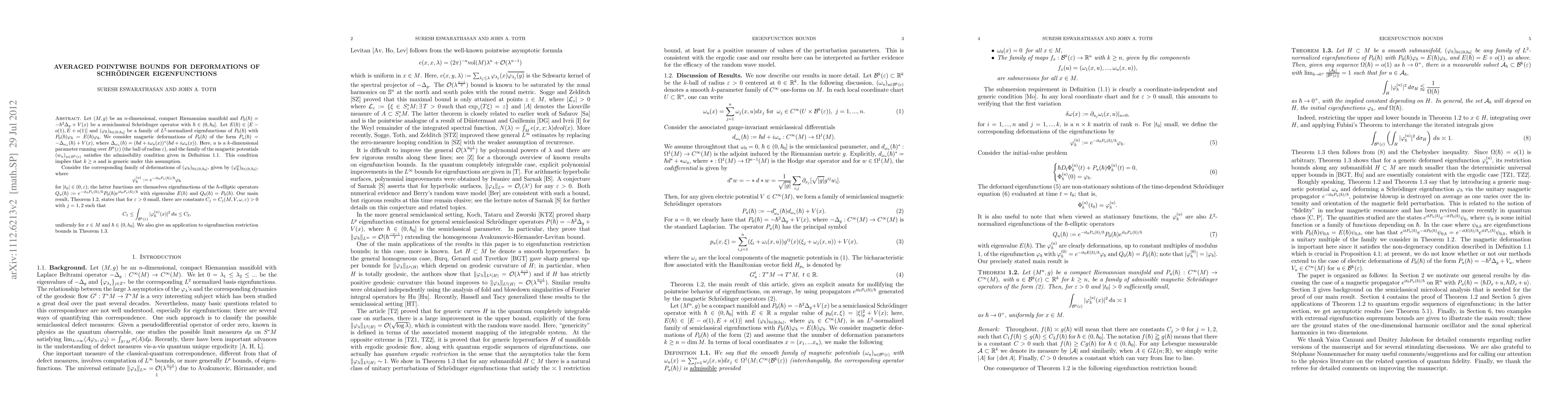 This paper establishes averaged pointwise bounds for deformations of Schrödinger eigenfunctions on a compact Riemannian manifold under magnetic perturbations. The study shows that these perturbations uniformly bound the $L^2$ norms of the deformed eigenfunctions, preventing eigenfunction blow-up, and provides applications including an eigenfunction restriction bound and a quantum ergodicity result.