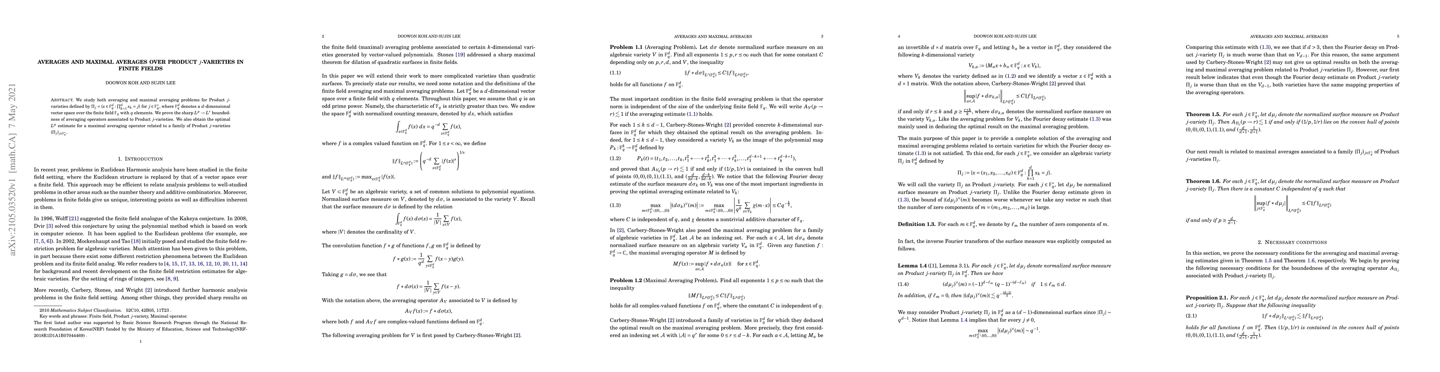 We study both averaging and maximal averaging problems for Product $j$-varieties defined by $\Pi_j=\{x\in \mathbb F_q^d: \prod_{k=1}^d x_k=j\}$ for $j\in \mathbb F_q^*,$ where $\mathbb F_q^d$ denotes a $d$-dimensional vector space over the finite field $\mathbb F_q$ with $q$ elements. We prove the sharp $L^p\to L^r$ boundedness of averaging operators associated to Product $j$-varieties. We also obtain the optimal $L^p$ estimate for a maximal averaging operator related to a family of Product $j$-varieties $\{\Pi_j\}_{j\in \mathbb F_q^*}.$