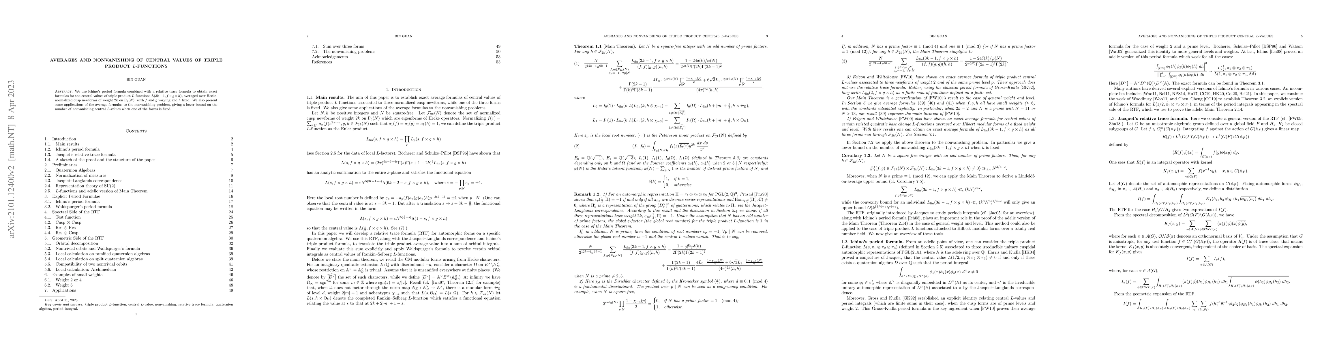 This paper demonstrates exact averages for $L$-functions associated with triple product cusp forms using Ichino's period formula and a relative trace formula. It also provides applications to the nonvanishing problem, establishing a lower bound on the number of nonvanishing central $L$-values for a fixed form.
