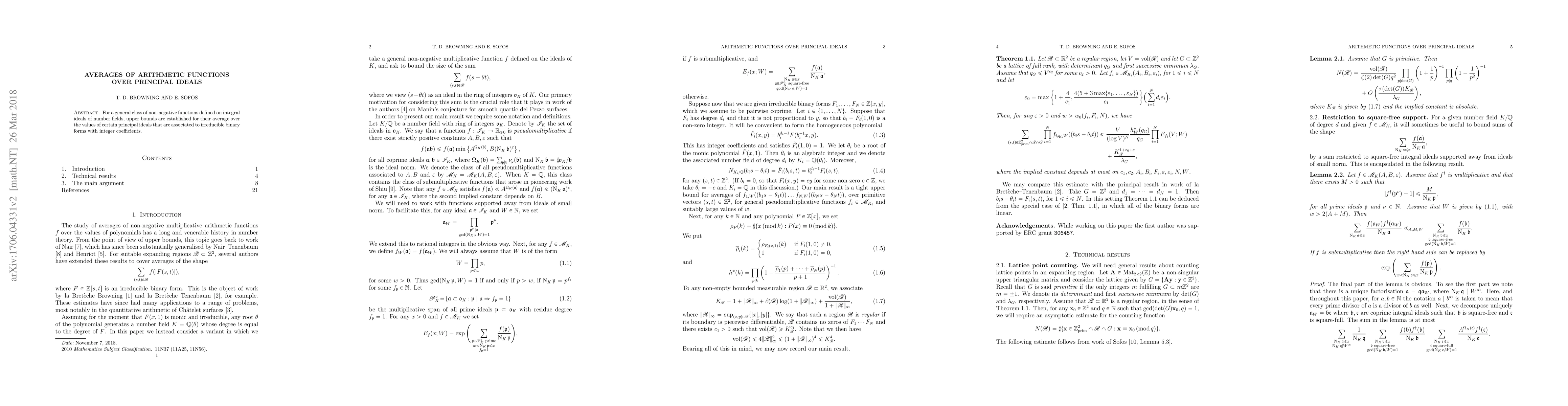 For a general class of non-negative functions defined on integral ideals of number fields, upper bounds are established for their average over the values of certain principal ideals that are associated to irreducible binary forms with integer coefficients.