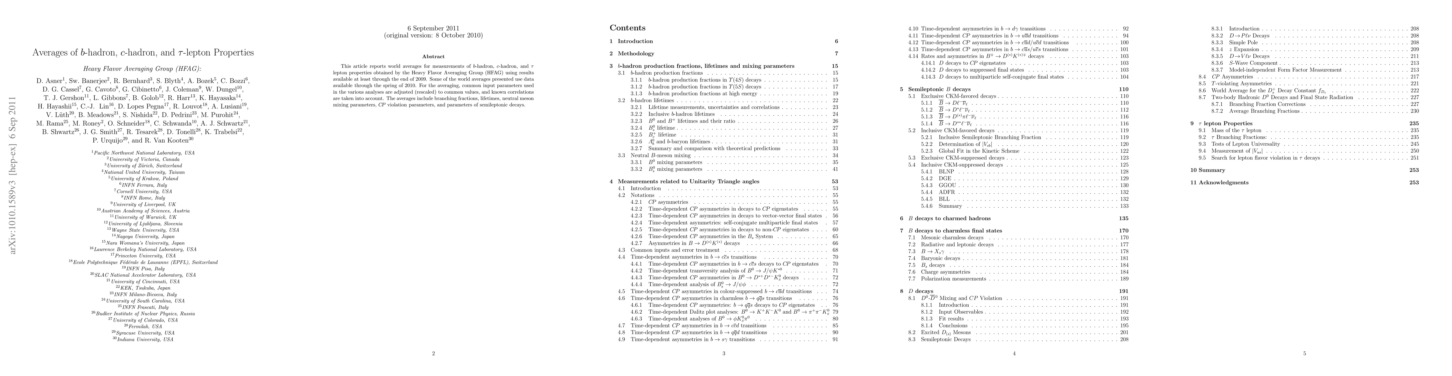 This paper presents world averages for b-hadron, c-hadron, and tau-lepton properties, compiled by the Heavy Flavor Averaging Group, using data up to 2010, including branching fractions, lifetimes, and CP violation parameters. Known correlations and common input parameters were rescaled for accurate averaging.