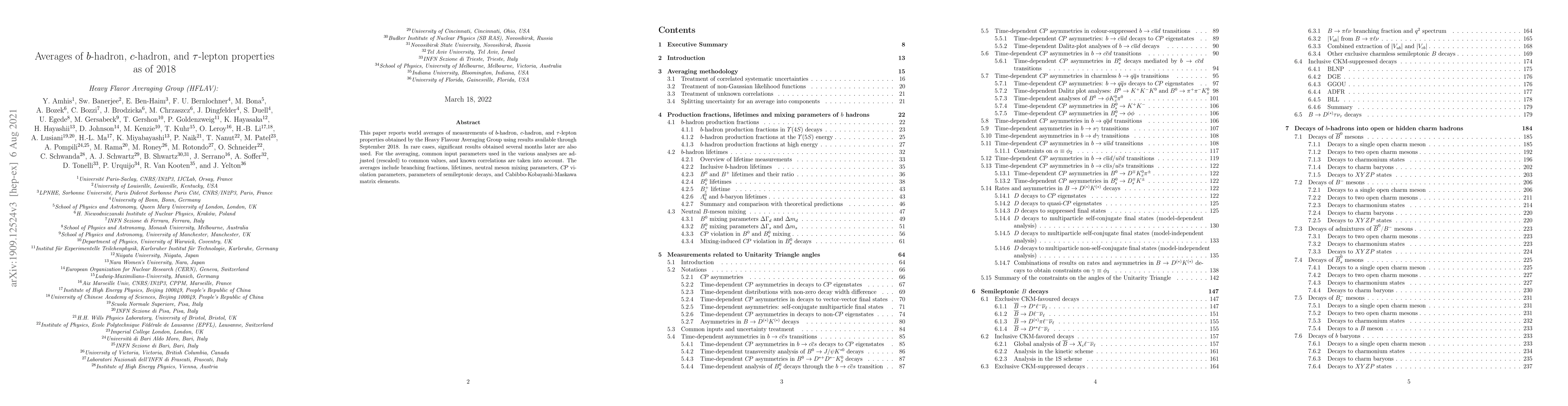 This paper reports world averages of measurements of $b$-hadron, $c$-hadron, and $\tau$-lepton properties obtained by the Heavy Flavor Averaging Group using results available through September 2018. In rare cases, significant results obtained several months later are also used. For the averaging, common input parameters used in the various analyses are adjusted (rescaled) to common values, and known correlations are taken into account. The averages include branching fractions, lifetimes, neutral meson mixing parameters, CP violation parameters, parameters of semileptonic decays, and Cabibbo-Kobayashi-Maskawa matrix elements.