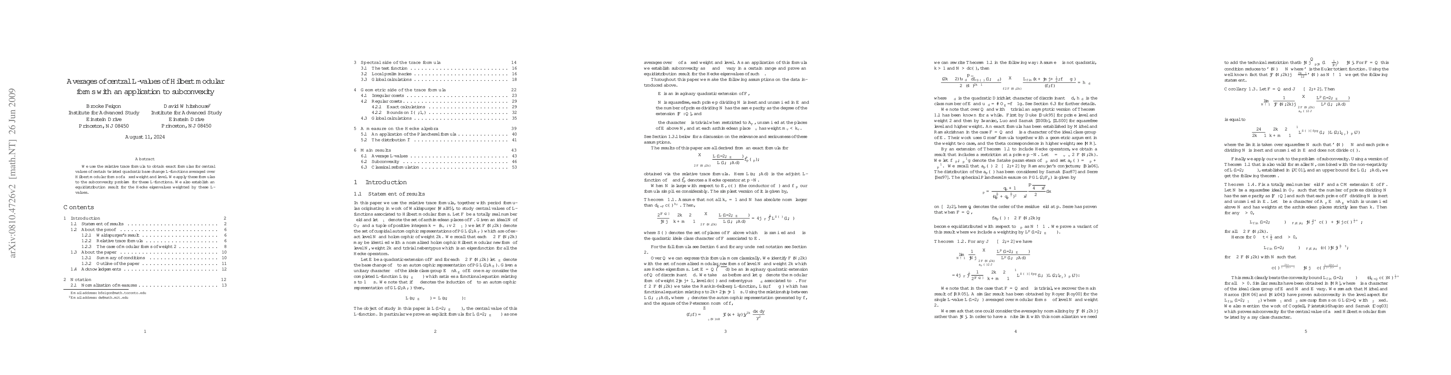 Summary: The paper derives exact formulas for averaged central values of twisted quadratic base change L-functions using the relative trace formula and applies them to solve subconvexity problems. Additionally, it presents an equidistribution result for Hecke eigenvalues weighted by these L-values.