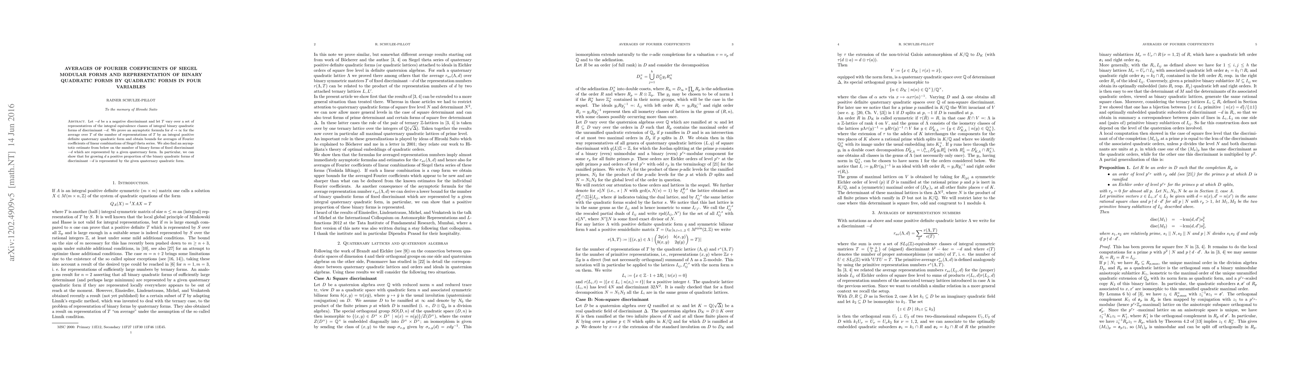 Summary: This paper establishes an asymptotic formula for the average number of representations of binary quadratic forms by quaternary quadratic forms as the discriminant increases. Additionally, it investigates averages of Fourier coefficients in Siegel modular forms and proves that a positive proportion of binary quadratic forms with a large discriminant are represented by a specific quaternary form.