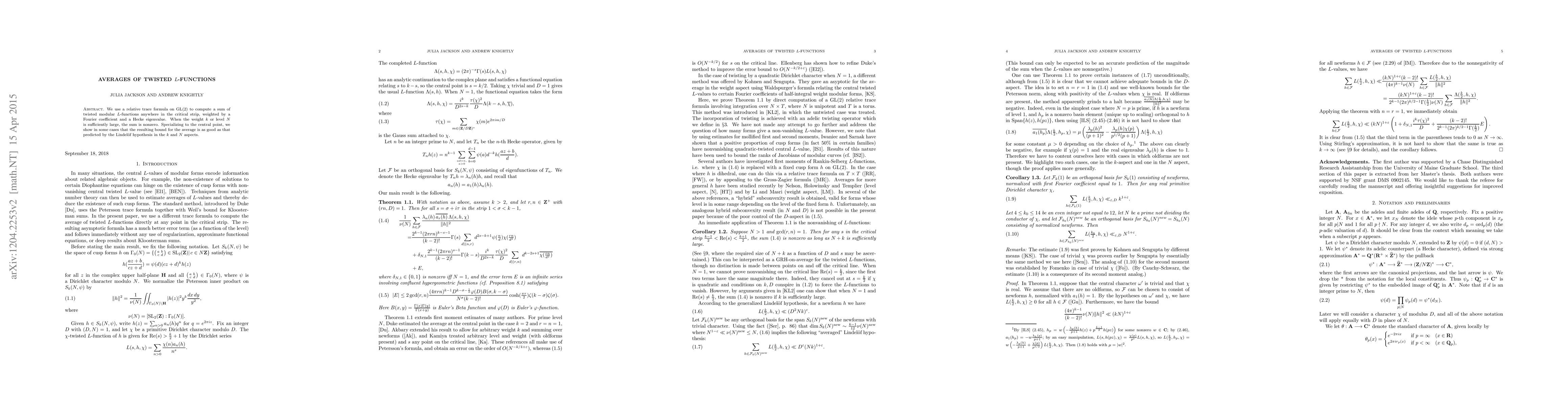 Researchers used a relative trace formula to compute the average of twisted L-functions, showing that large values can produce non-zero results, which in some cases match predictions from the Lindelof hypothesis.