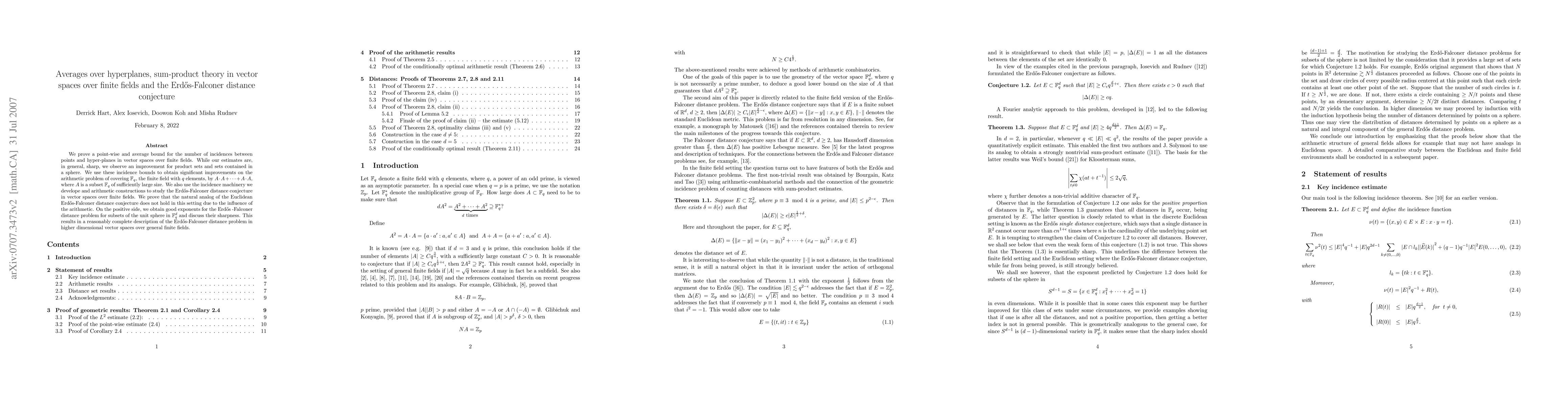 This paper establishes sharp incidence bounds for points and hyperplanes in vector spaces over finite fields, improving estimates for product sets and spherical subsets. It leverages these bounds to enhance the covering problem for finite fields and provides a comprehensive analysis of the Erdos-Falconer distance conjecture in this context, revealing its failure due to arithmetic influences while offering good results for subsets on the unit sphere.
