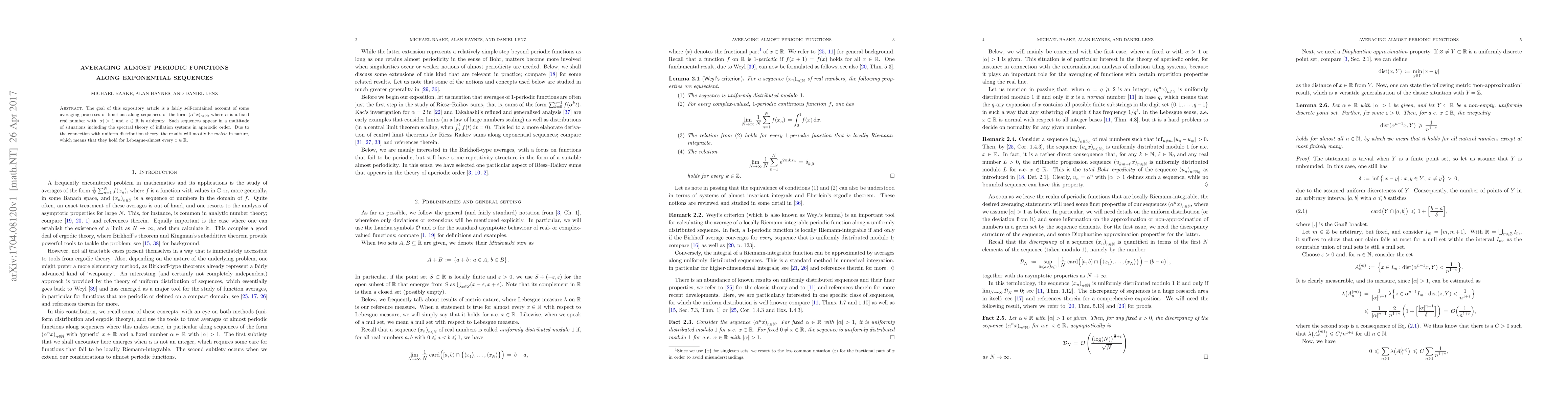 This paper explores how to average almost periodic functions along exponential sequences, with a focus on results that hold for most real numbers, and has connections to uniform distribution theory.