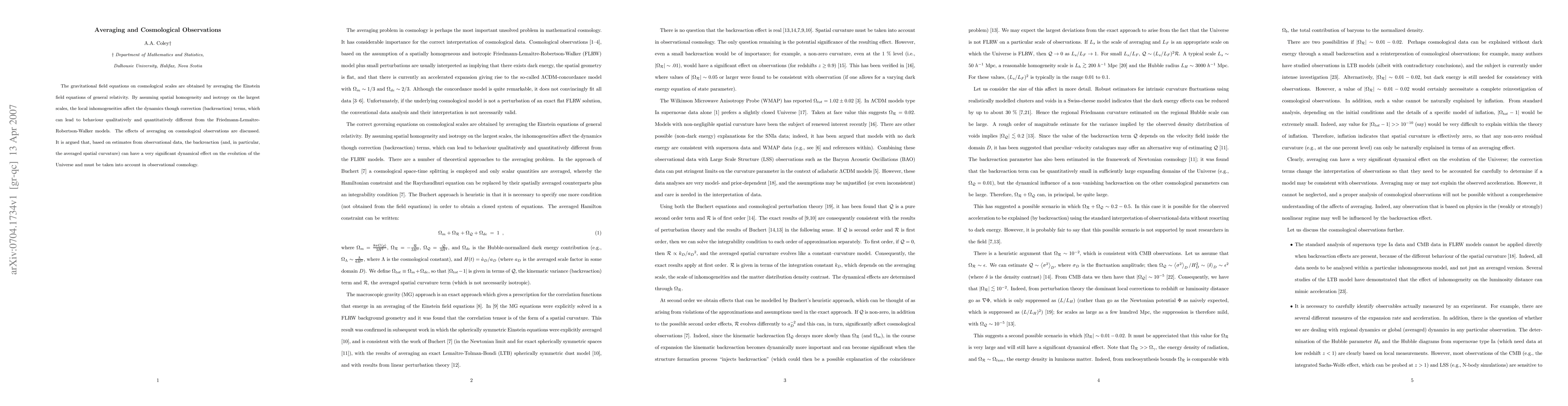 The gravitational field equations on cosmological scales are obtained by averaging the Einstein field equations of general relativity. By assuming spatial homogeneity and isotropy on the largest scales, the local inhomogeneities affect the dynamics though correction (backreaction) terms, which can lead to behaviour qualitatively and quantitatively different from the Friedmann-Lema\^{i}tre-Robertson-Walker models. The effects of averaging on cosmological observations are discussed. It is argued that, based on estimates from observational data, the backreaction (and, in particular, the averaged spatial curvature) can have a very significant dynamical effect on the evolution of the Universe and must be taken into account in observational cosmology.
