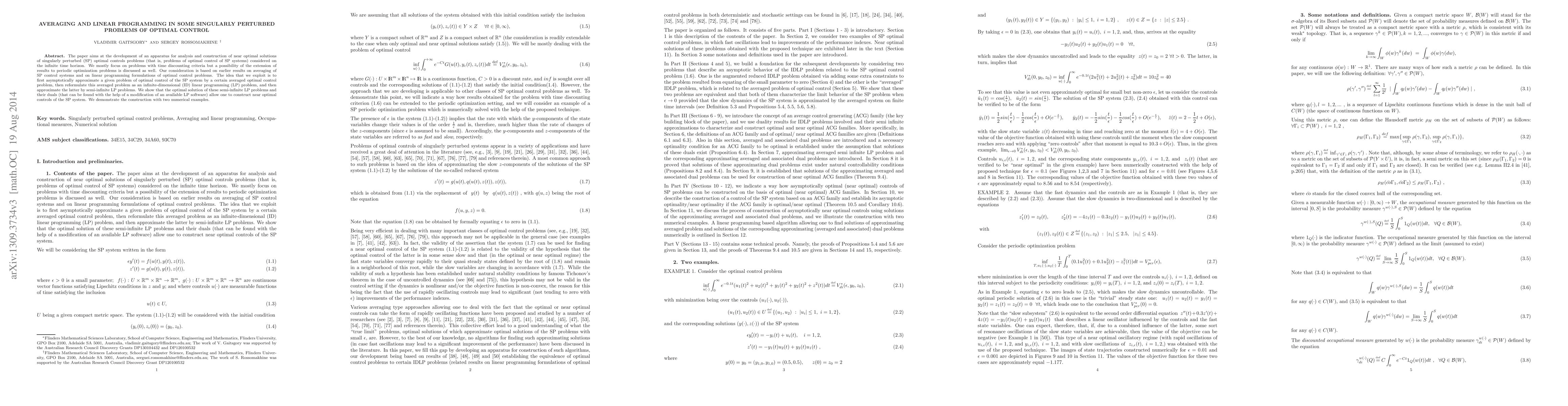 This paper develops an analytical framework for constructing near-optimal solutions to singularly perturbed optimal control problems using averaging and linear programming techniques. It reformulates the original problem into an infinite-dimensional linear programming problem, which is then approximated by semi-infinite LP problems, allowing for the construction of near-optimal controls.