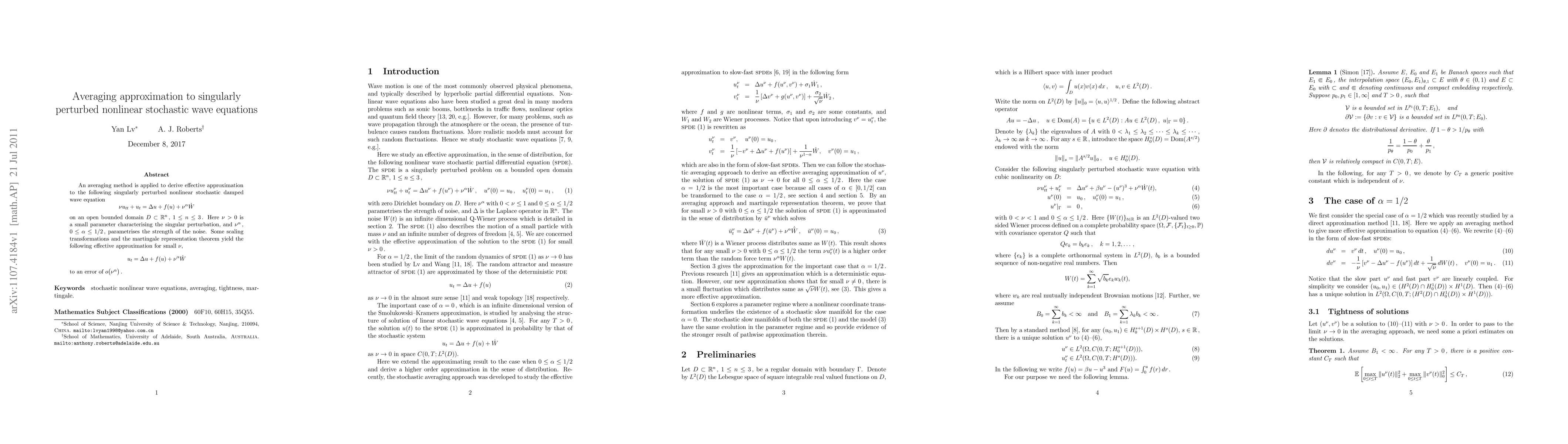This paper applies an averaging method to derive an effective approximation for a singularly perturbed nonlinear stochastic wave equation. The derived approximation, valid for small perturbation parameters, reduces the original equation to a simpler form with an error of order $\nu^\alpha$.
