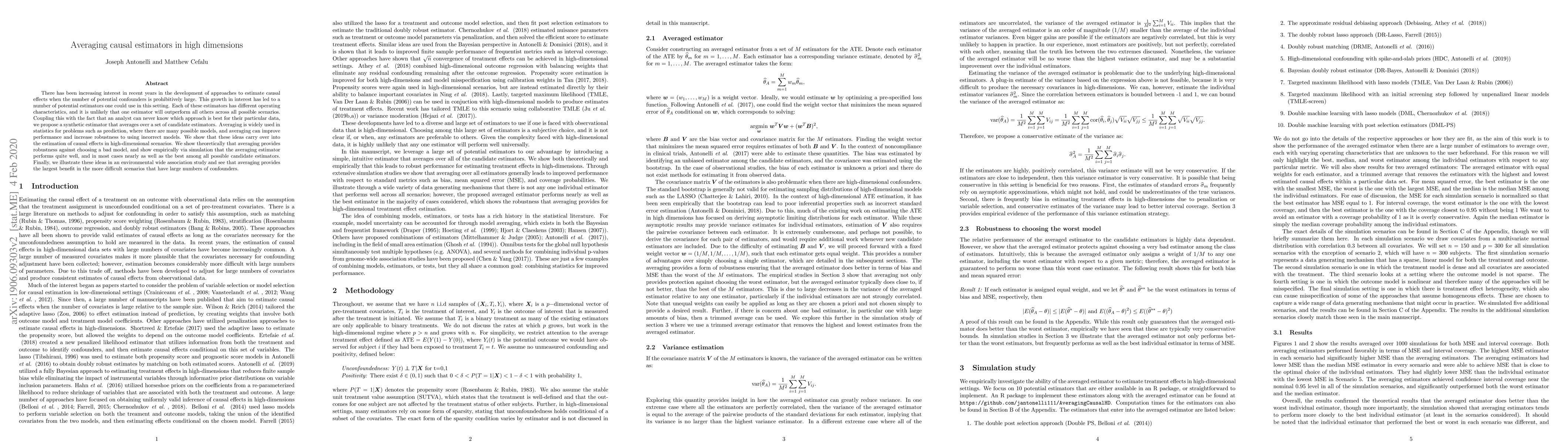 There has been increasing interest in recent years in the development of approaches to estimate causal effects when the number of potential confounders is prohibitively large. This growth in interest has led to a number of potential estimators one could use in this setting. Each of these estimators has different operating characteristics, and it is unlikely that one estimator will outperform all others across all possible scenarios. Coupling this with the fact that an analyst can never know which approach is best for their particular data, we propose a synthetic estimator that averages over a set of candidate estimators. Averaging is widely used in statistics for problems such as prediction, where there are many possible models, and averaging can improve performance and increase robustness to using incorrect models. We show that these ideas carry over into the estimation of causal effects in high-dimensional scenarios. We show theoretically that averaging provides robustness against choosing a bad model, and show empirically via simulation that the averaging estimator performs quite well, and in most cases nearly as well as the best among all possible candidate estimators. Finally, we illustrate these ideas in an environmental wide association study and see that averaging provides the largest benefit in the more difficult scenarios that have large numbers of confounders.