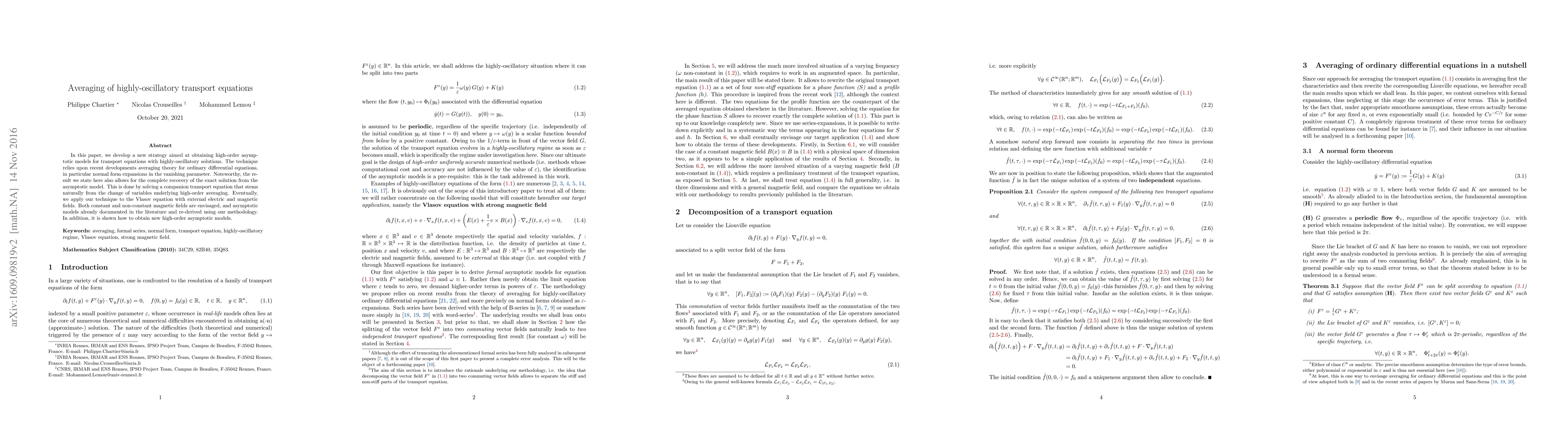 In this paper, we develop a new strategy aimed at obtaining high-order asymptotic models for transport equations with highly-oscillatory solutions. The technique relies upon recent developments averaging theory for ordinary differential equations, in particular normal form expansions in the vanishing parameter. Noteworthy, the result we state here also allows for the complete recovery of the exact solution from the asymptotic model. This is done by solving a companion transport equation that stems naturally from the change of variables underlying high-order averaging. Eventually, we apply our technique to the Vlasov equation with external electric and magnetic fields. Both constant and non-constant magnetic fields are envisaged, and asymptotic models already documented in the literature and re-derived using our methodology. In addition, it is shown how to obtain new high-order asymptotic models.