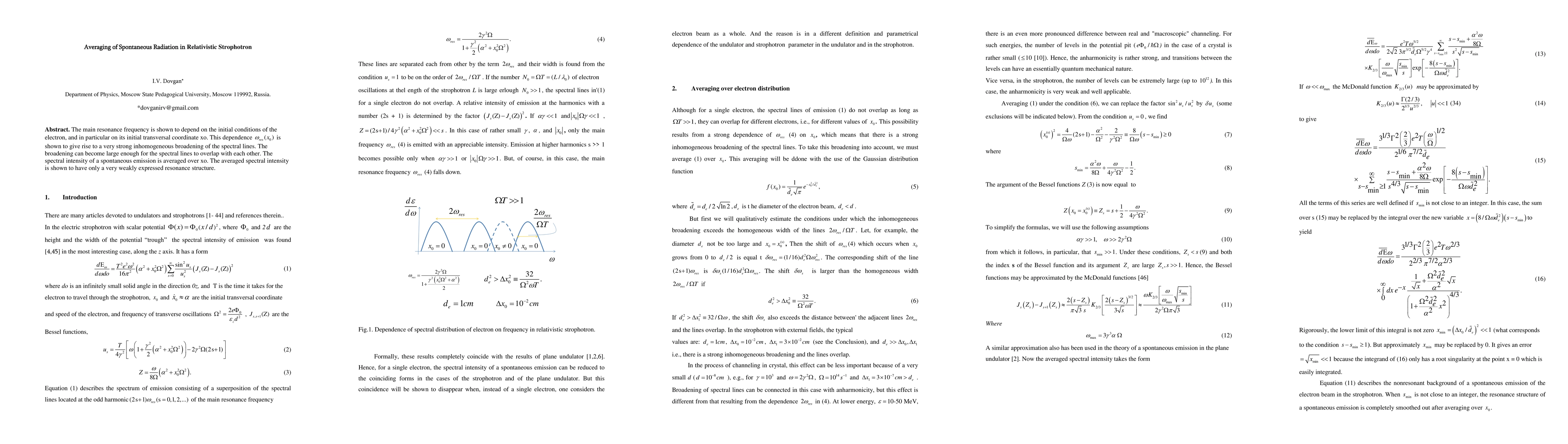 The main resonance frequency is shown to depend on the initial conditions of the electron, and in particular on its initial transversal coordinate xo. This dependence is shown to give rise to a very strong inhomogeneous broadening of the spectral lines. The broadening can become large enough for the spectral lines to overlap with each other. The spectral intensity of a spontaneous emission is averaged over xo. The averaged spectral intensity is shown to have only a very weakly expressed resonance structure.