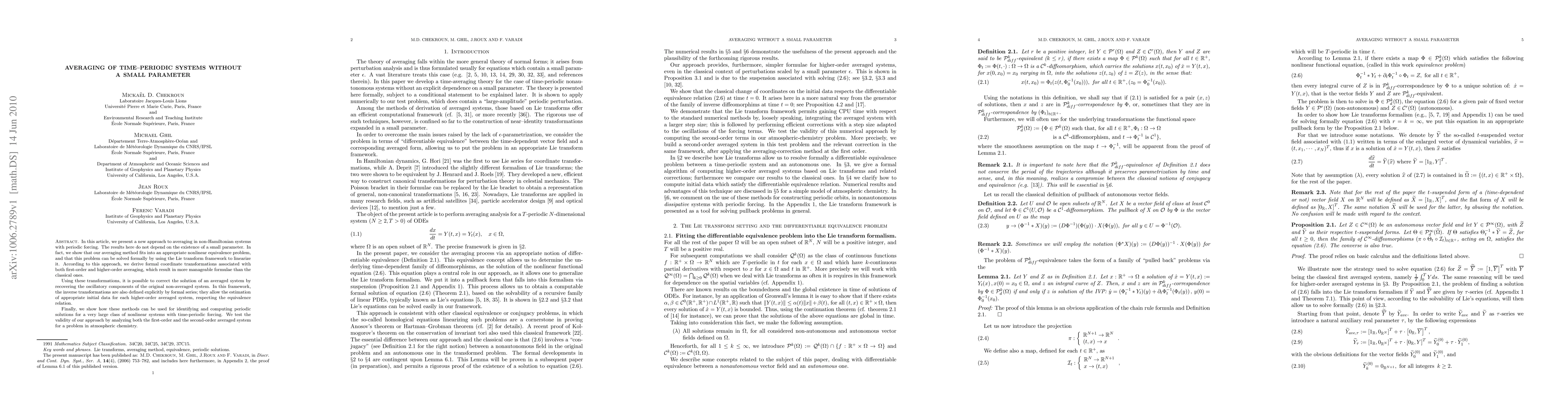 In this article, we present a new approach to averaging in non-Hamiltonian systems with periodic forcing. The results here do not depend on the existence of a small parameter. In fact, we show that our averaging method fits into an appropriate nonlinear equivalence problem, and that this problem can be solved formally by using the Lie transform framework to linearize it. According to this approach, we derive formal coordinate transformations associated with both first-order and higher-order averaging, which result in more manageable formulae than the classical ones. Using these transformations, it is possible to correct the solution of an averaged system by recovering the oscillatory components of the original non-averaged system. In this framework, the inverse transformations are also defined explicitly by formal series; they allow the estimation of appropriate initial data for each higher-order averaged system, respecting the equivalence relation. Finally, we show how these methods can be used for identifying and computing periodic solutions for a very large class of nonlinear systems with time-periodic forcing. We test the validity of our approach by analyzing both the first-order and the second-order averaged system for a problem in atmospheric chemistry.