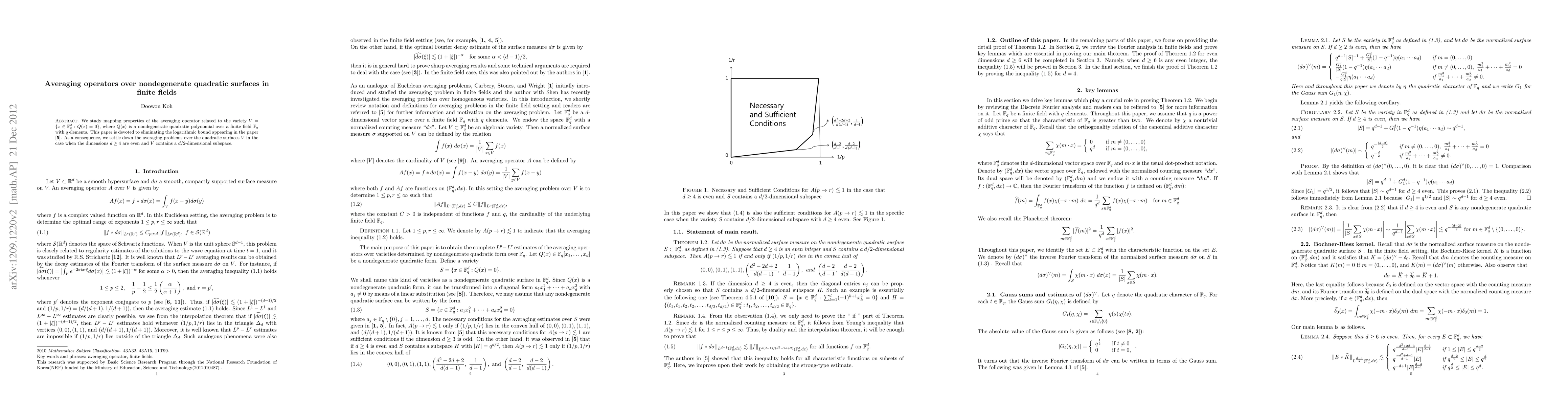 This paper investigates the mapping properties of averaging operators over nondegenerate quadratic surfaces in finite fields, focusing on eliminating a logarithmic bound, and settles the averaging problem for specific cases with even dimensions and certain subspaces.