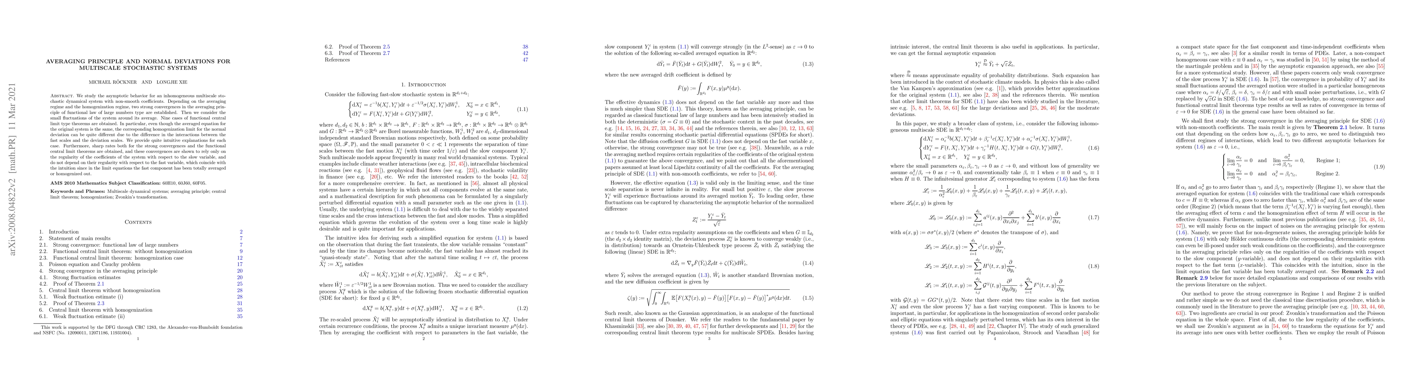 We study the asymptotic behavior for an inhomogeneous multiscale stochastic dynamical system with non-smooth coefficients. Depending on the averaging regime and the homogenization regime, two strong convergences in the averaging principle of functional law of large numbers type are established. Then we consider the small fluctuations of the system around its average. Nine cases of functional central limit type theorems are obtained. In particular, even though the averaged equation for the original system is the same, the corresponding homogenization limit for the normal deviation can be quite different due to the difference in the interactions between the fast scales and the deviation scales. We provide quite intuitive explanations for each case. Furthermore, sharp rates both for the strong convergences and the functional central limit theorems are obtained, and these convergences are shown to rely only on the regularity of the coefficients of the system with respect to the slow variable, and do not depend on their regularity with respect to the fast variable, which coincide with the intuition since in the limit equations the fast component has been totally averaged or homogenized out.