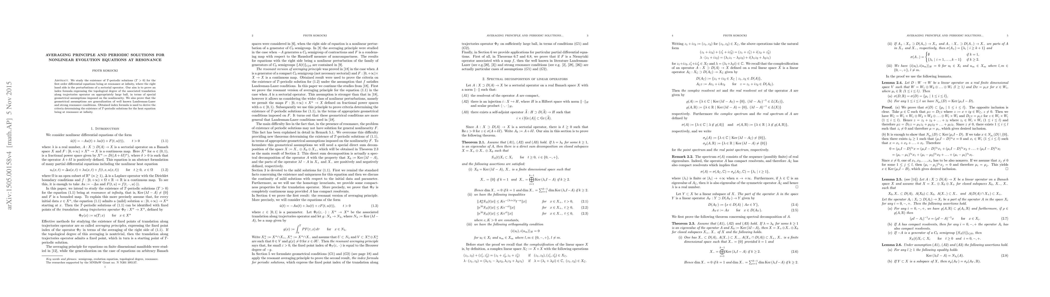 This paper presents an index formula for determining T-periodic solutions in nonlinear evolution equations at resonance, generalizing Landesman-Lazer and strong resonance conditions. The formula uses geometrical assumptions on nonlinearity and is applied to derive existence criteria for T-periodic solutions in the heat equation at resonance.