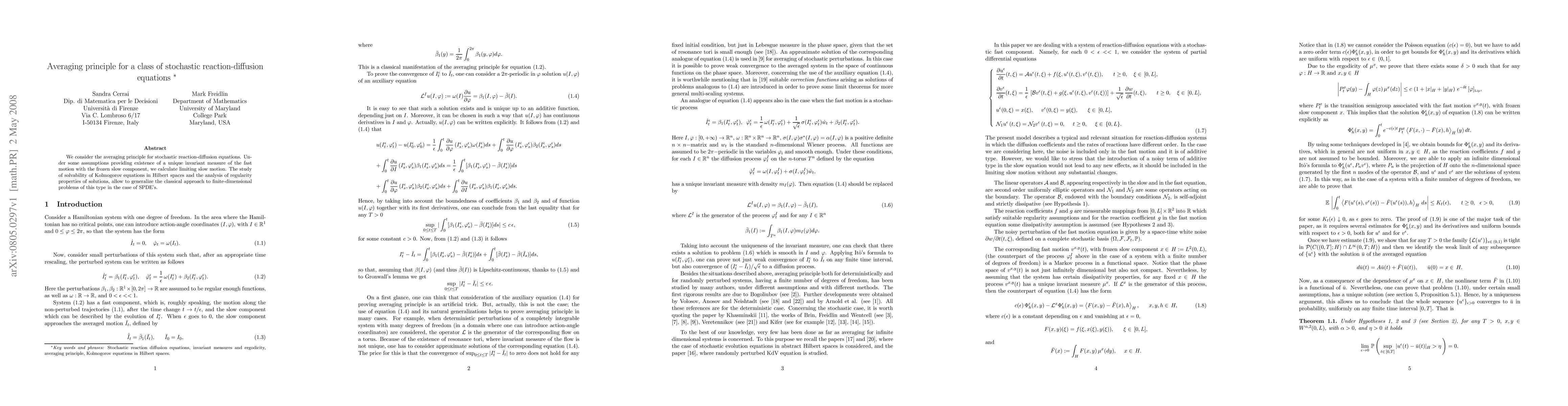 Summary: This paper explores the averaging principle for stochastic reaction-diffusion equations, deriving the limiting slow motion under specific conditions and extending classical finite-dimensional methods to stochastic partial differential equations (SPDEs) through the analysis of Kolmogorov equations and solution regularity.