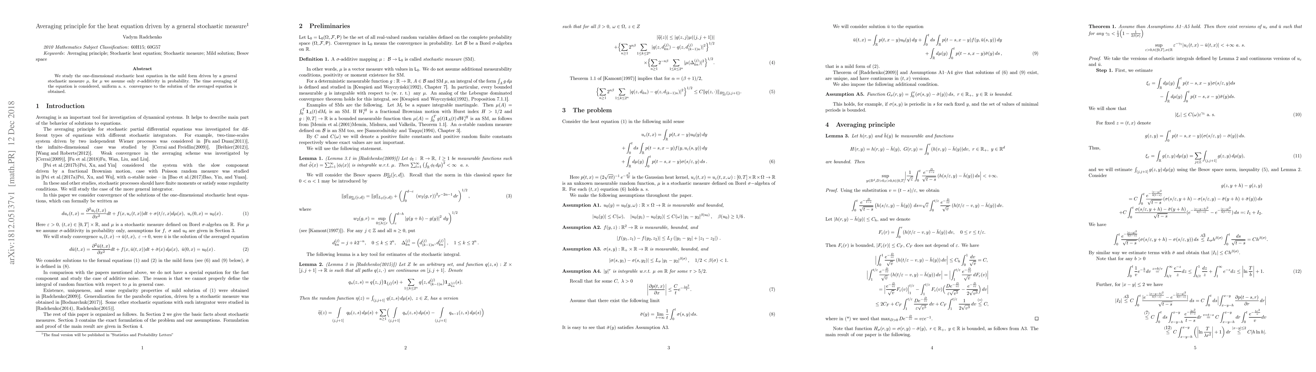 Summary: This paper explores the one-dimensional stochastic heat equation driven by a general stochastic measure, focusing on uniform almost sure convergence to the solution of the averaged equation under mild assumptions on $\sigma$-additivity in probability.